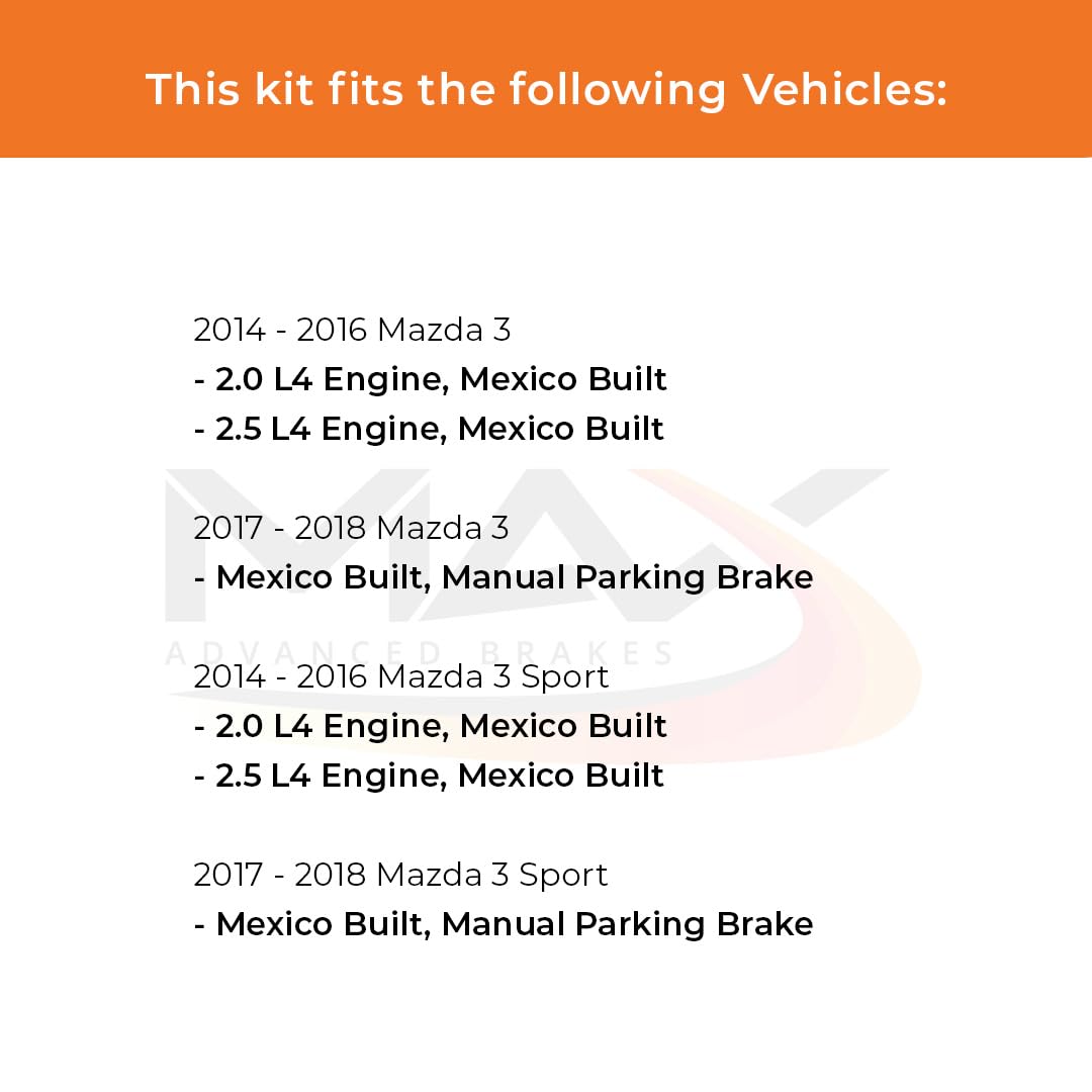 Q: What vehicles are compatible with the Max Advanced Brakes Front & Rear Brake Kit?A: The Max Advanced Brakes Front & Rear Brake Kit is specifically designed for 2014-2018 Mazda 3 and 2014-2018 Mazda 3 Sport models that are Mexico built. To ensure perfect fitment, it's essential to verify your vehicle's details such as year, model, sub-model, engine size, and VIN# before purchasing.