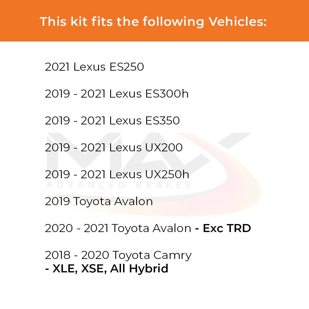 Q: What vehicles are compatible with the Max Advanced Brakes Front & Rear Brake Kit?A: The Max Advanced Brakes Front & Rear Brake Kit is compatible with various models, including the 2021 Lexus ES250, 2019-2021 ES300h, ES350, UX200, 2019 Toyota Avalon, 2018-2021 Camry, 2020-2021 C-HR, and 2019-2021 RAV4 with 12.01" front rotors. It's essential to confirm your vehicle's specifics for a 100% fitment guarantee.