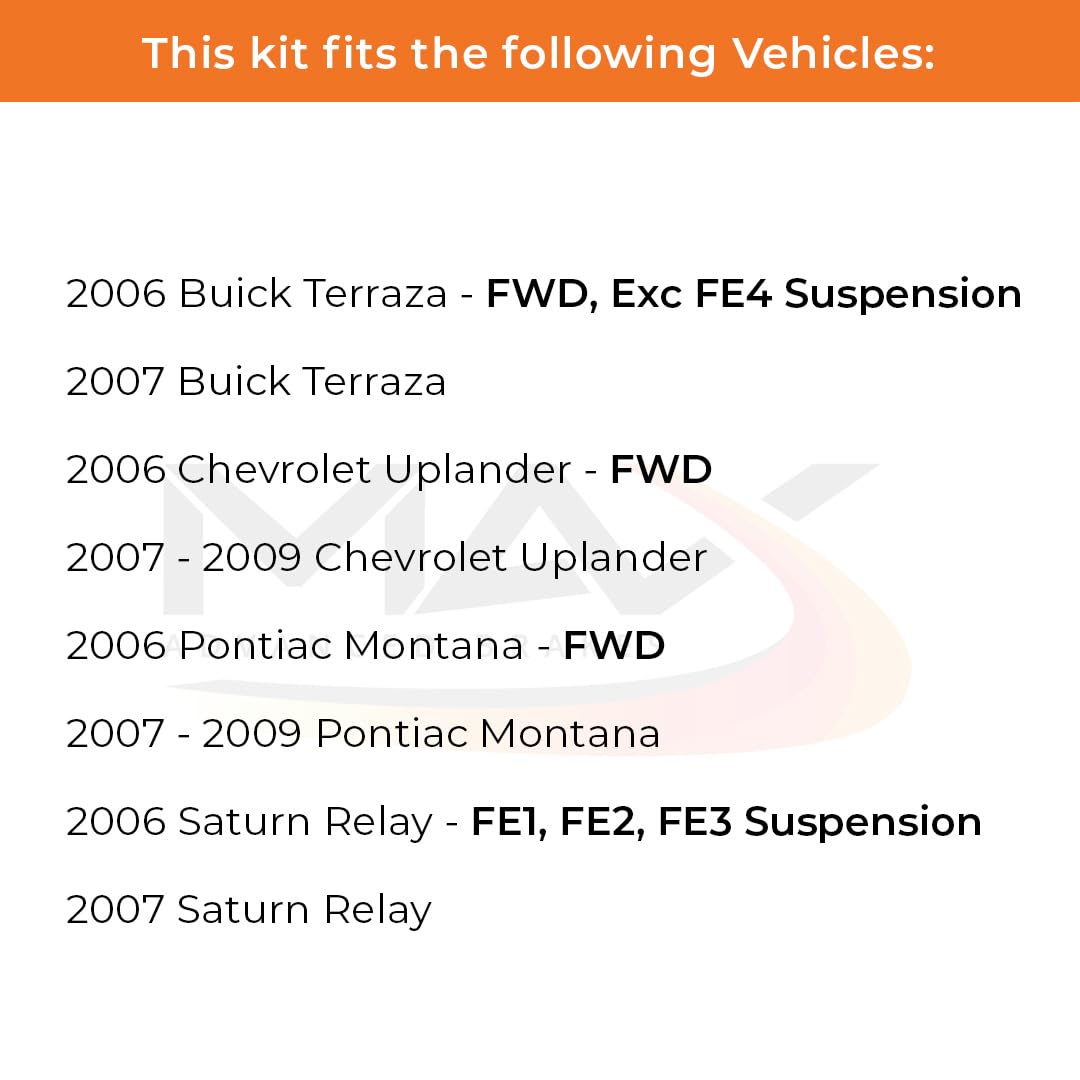 Q: What vehicles are compatible with the Max Advanced Brakes Rear Brake Kit?A: The Max Advanced Brakes Rear Brake Kit is specifically designed for the 2006-2009 Chevy Uplander, Pontiac Montana (2006, 2007), Buick Terraza, and Saturn Relay. To ensure a perfect fit, please verify your vehicle's details during the ordering process, including Year, Model, Sub-Model, Engine Size, and other specifications.