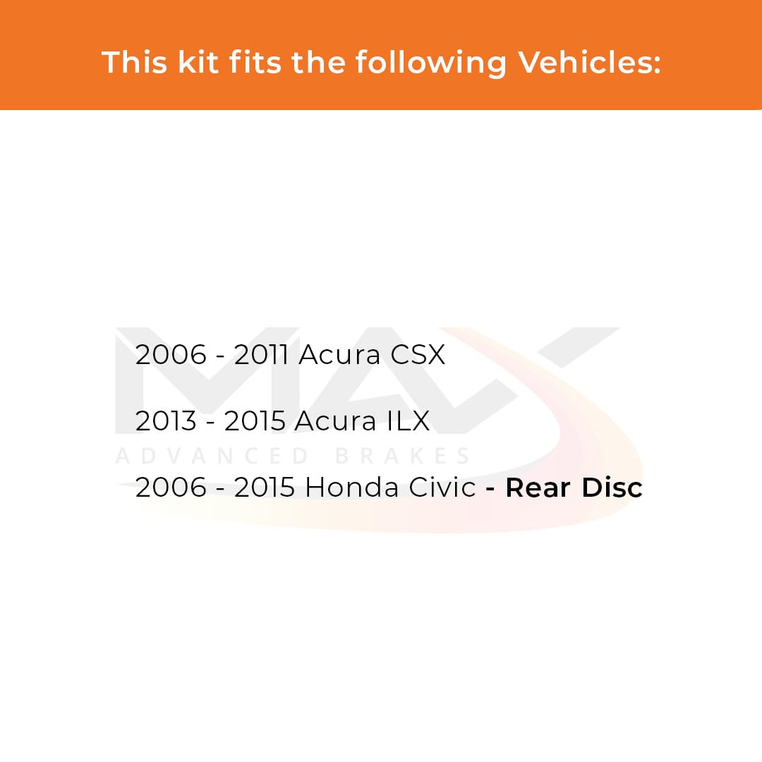 Q: What vehicles are compatible with the Max Advanced Brakes Rear Brake Kit?A: This brake kit is specifically designed for the 2006-2015 Honda Civic models with rear disc brakes, as well as the 2006-2011 Acura CSX and 2013-2015 Acura ILX. It is important to verify your vehicle's details, including year, model, and engine size, to ensure proper fitment.
