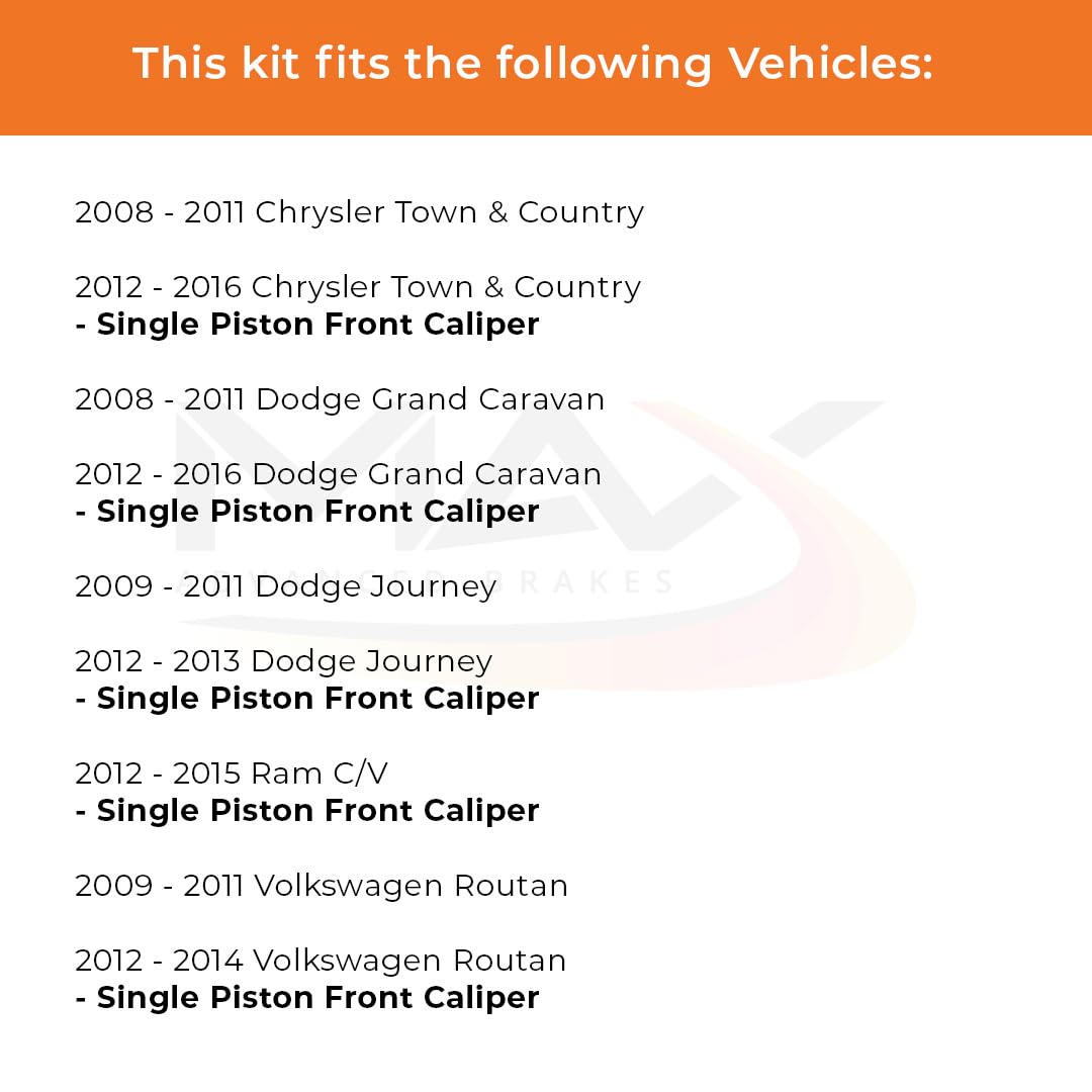 Q: What vehicles are compatible with the Max Advanced Brakes Rear Brake Kit?A: The Max Advanced Brakes Rear Brake Kit is compatible with 2008-2016 Dodge Grand Caravan and Chrysler Town & Country models with a Single Piston Front Caliper. It also fits the Dodge Journey (2009-2013) and Volkswagen Routan (2009-2014) with similar specifications.