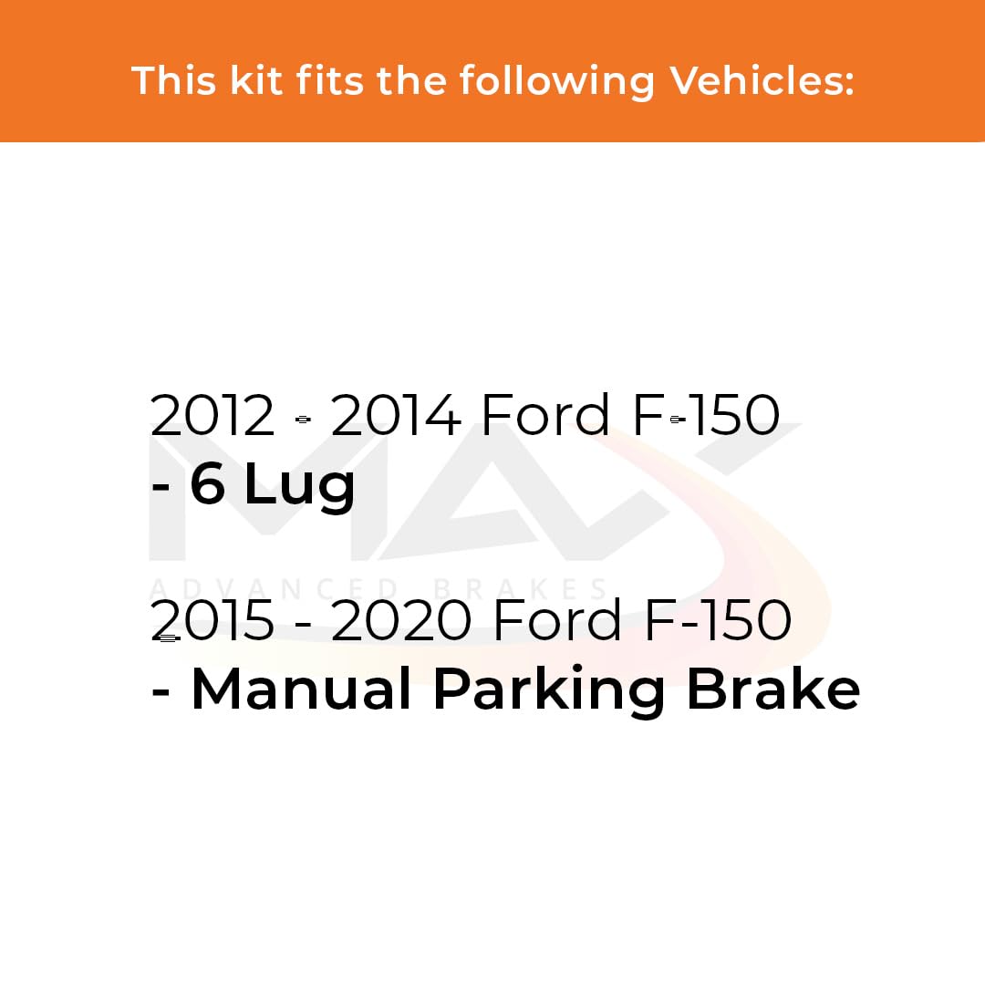Q: What vehicles are compatible with the Max Advanced Brakes Rear Brake Kit?A: The Max Advanced Brakes Rear Brake Kit is designed specifically for the 2012 to 2020 Ford F150 with a 6 Lug configuration and Manual Parking Brake. To ensure proper fitment, please confirm your vehicle's Year, Model, Sub-Model, Engine Size, 2WD/4WD, and other specifications before ordering.