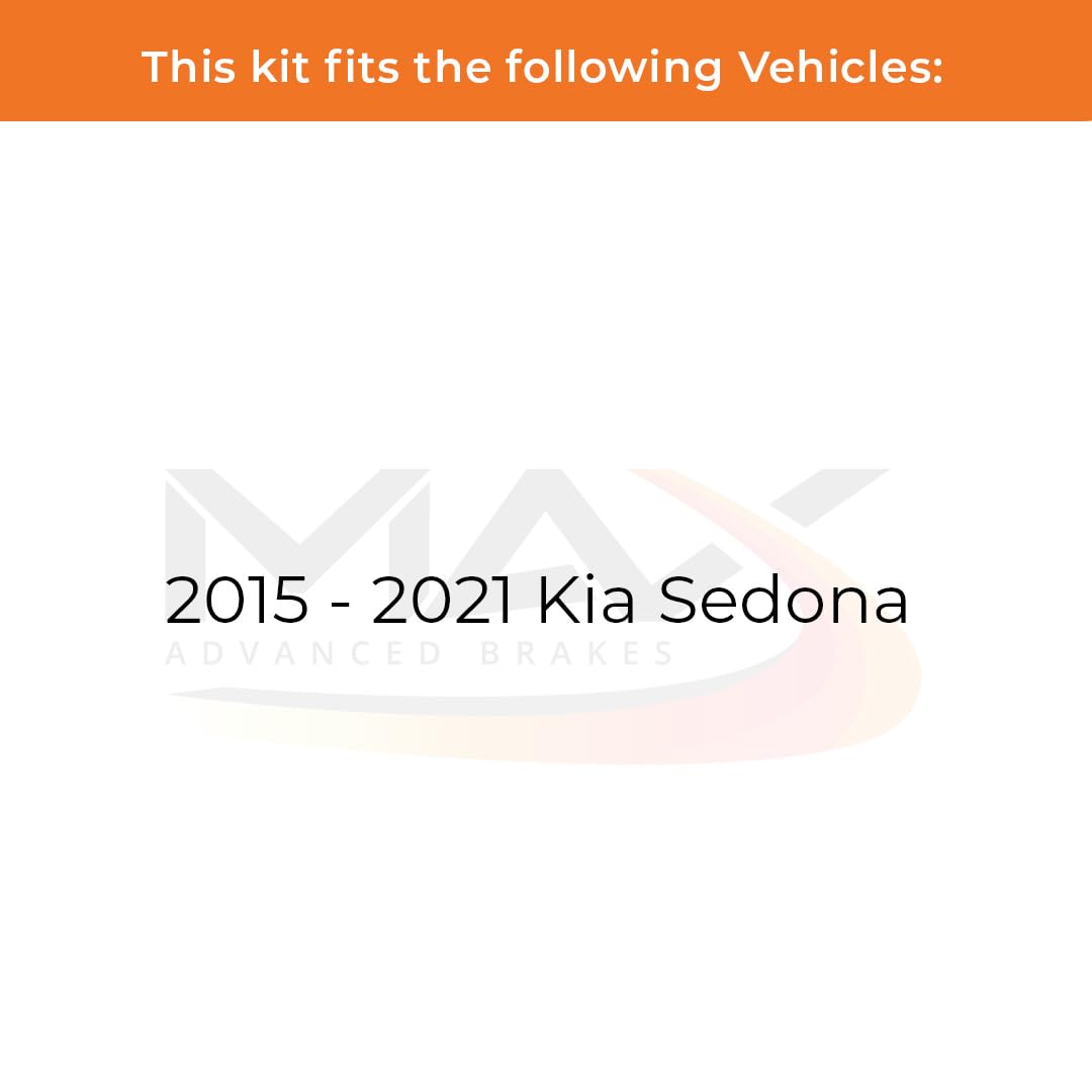 Q: What vehicles are compatible with the Max Advanced Brakes Rear Brake Kit?A: The Max Advanced Brakes Rear Brake Kit is specifically designed to fit the 2015, 2016, 2017, 2018, 2019, 2020, and 2021 Kia Sedona. It's important to verify your vehicle's details, including Year, Model, Sub-Model, and other specifications during the ordering process for a guaranteed fit.