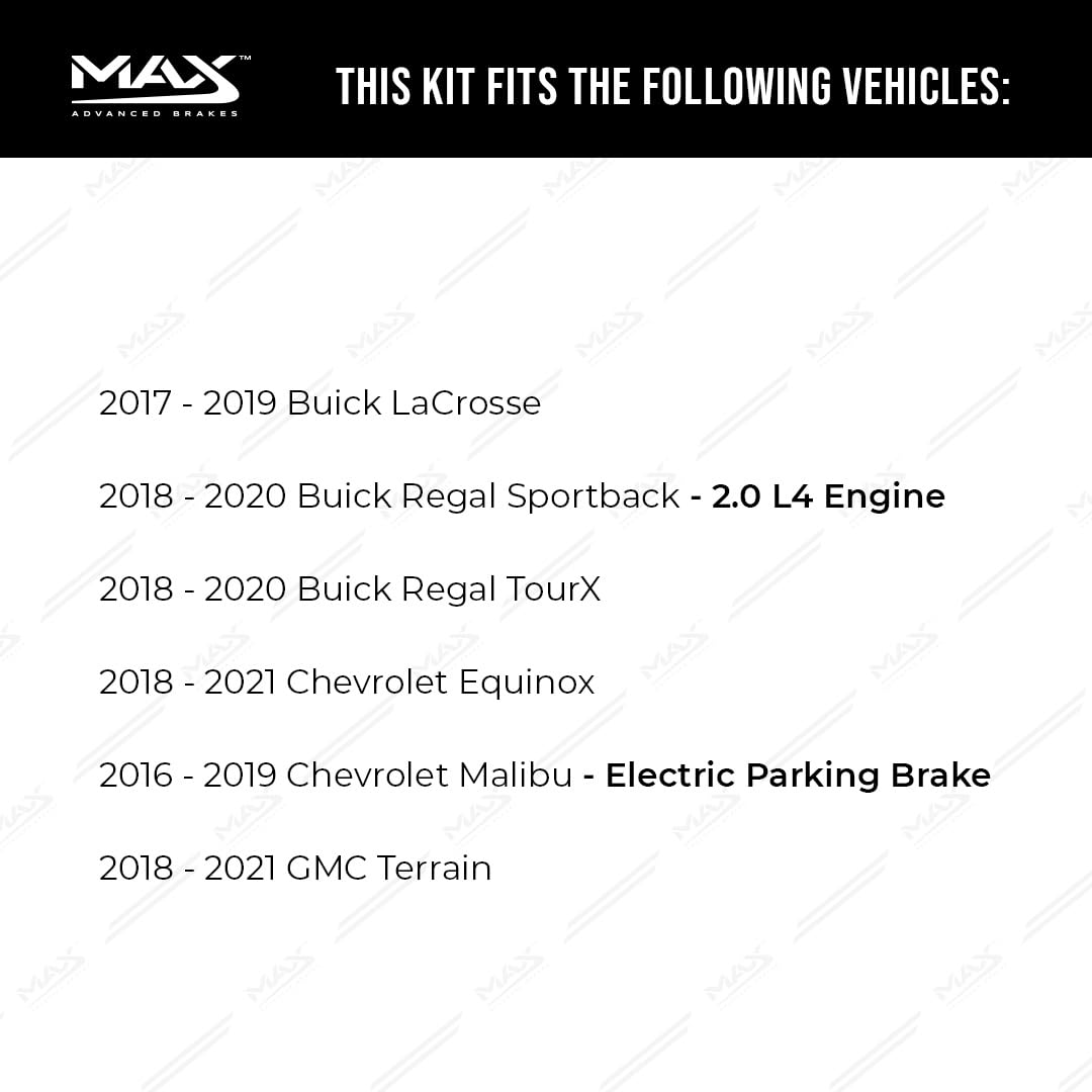 Q: What vehicles are compatible with the Max Advanced Brakes Rear Brake Kit?A: The Max Advanced Brakes Rear Brake Kit is compatible with the 2016-2021 Chevrolet Malibu w/EPB, 2018-2021 Chevrolet Equinox, GMC Terrain, and 2017-2019 Buick LaCrosse, as well as the 2018-2020 Buick Regal Sportback TourX. Ensure to verify your vehicle's specific details for a perfect fit.