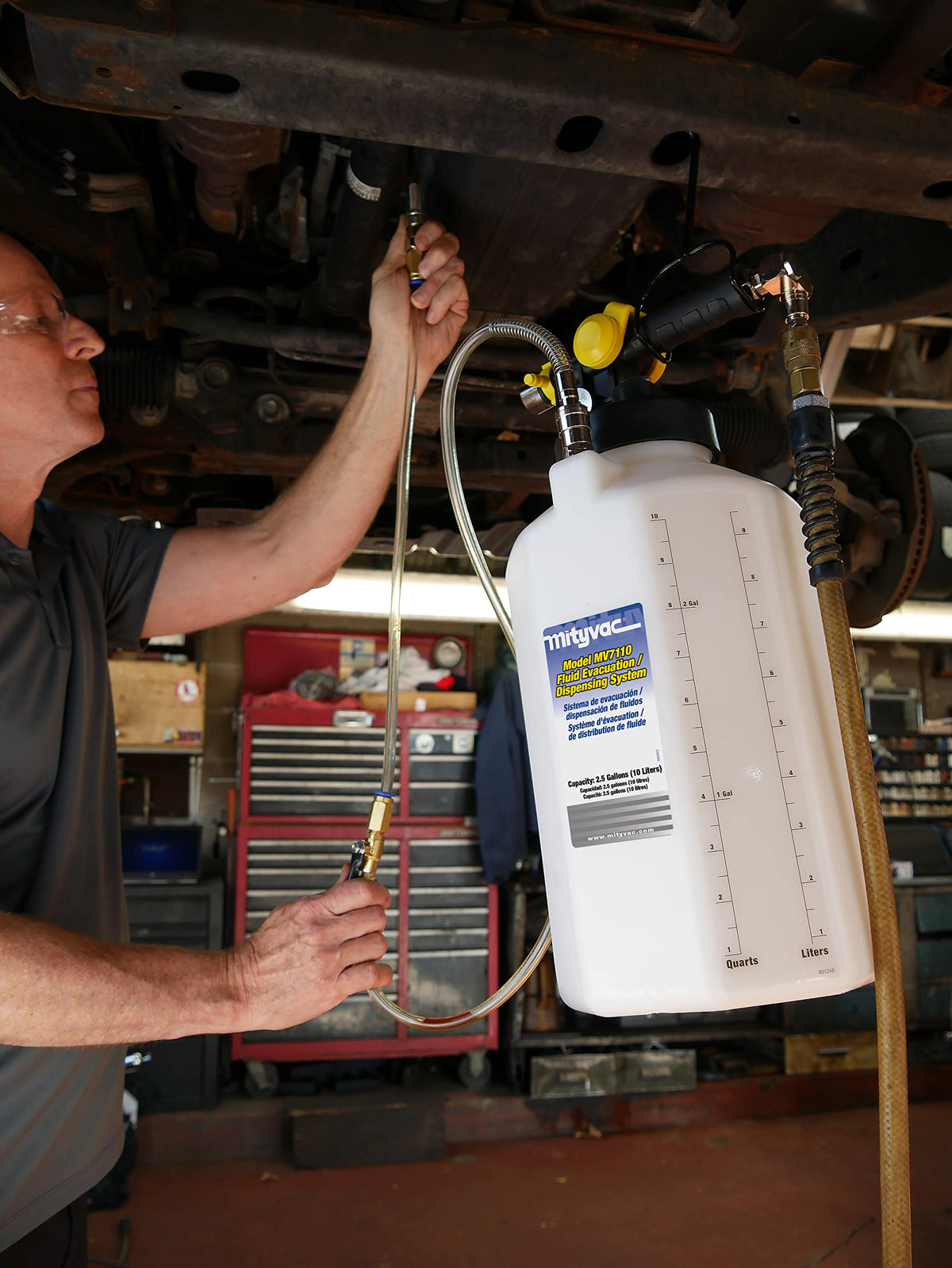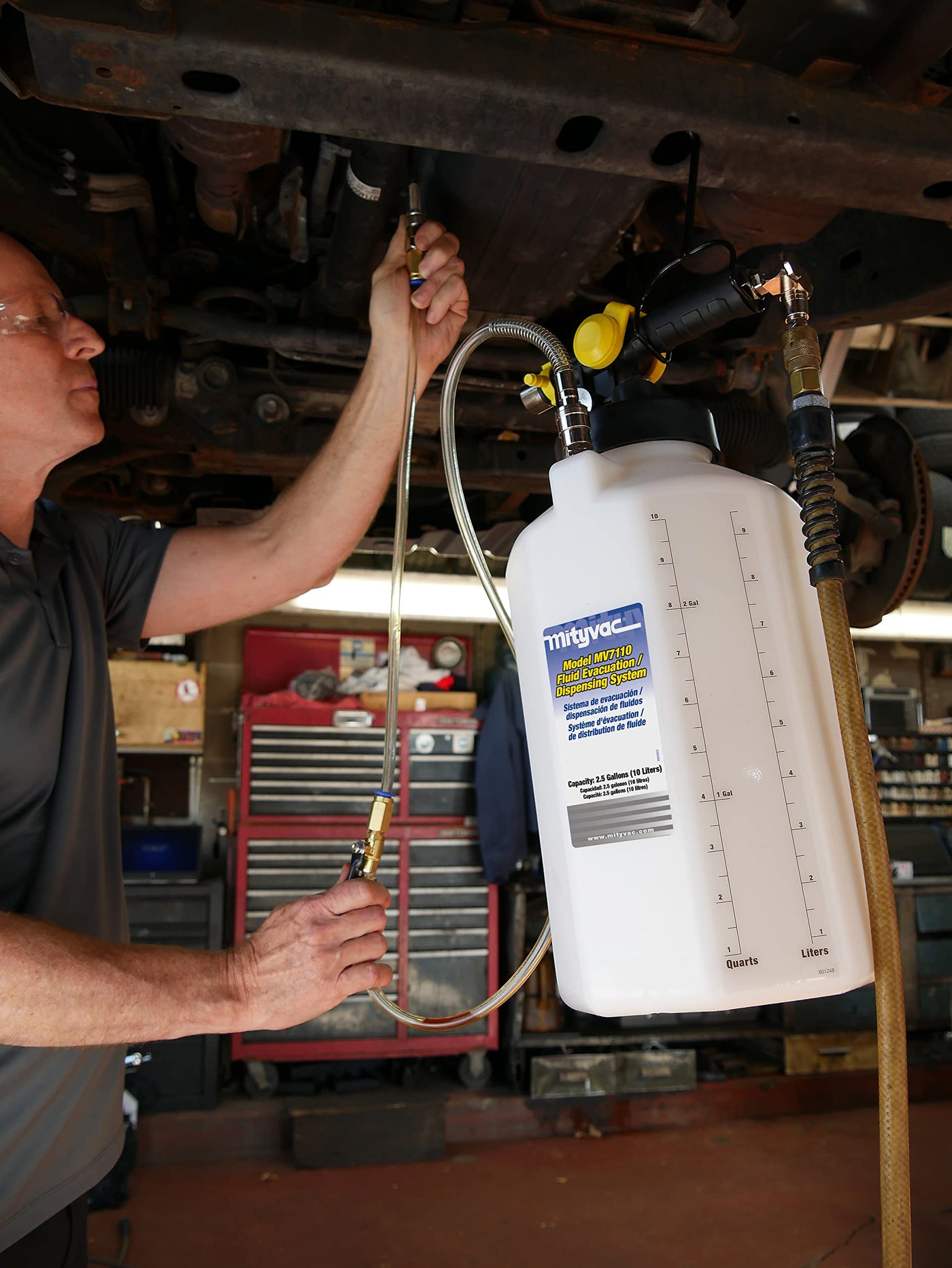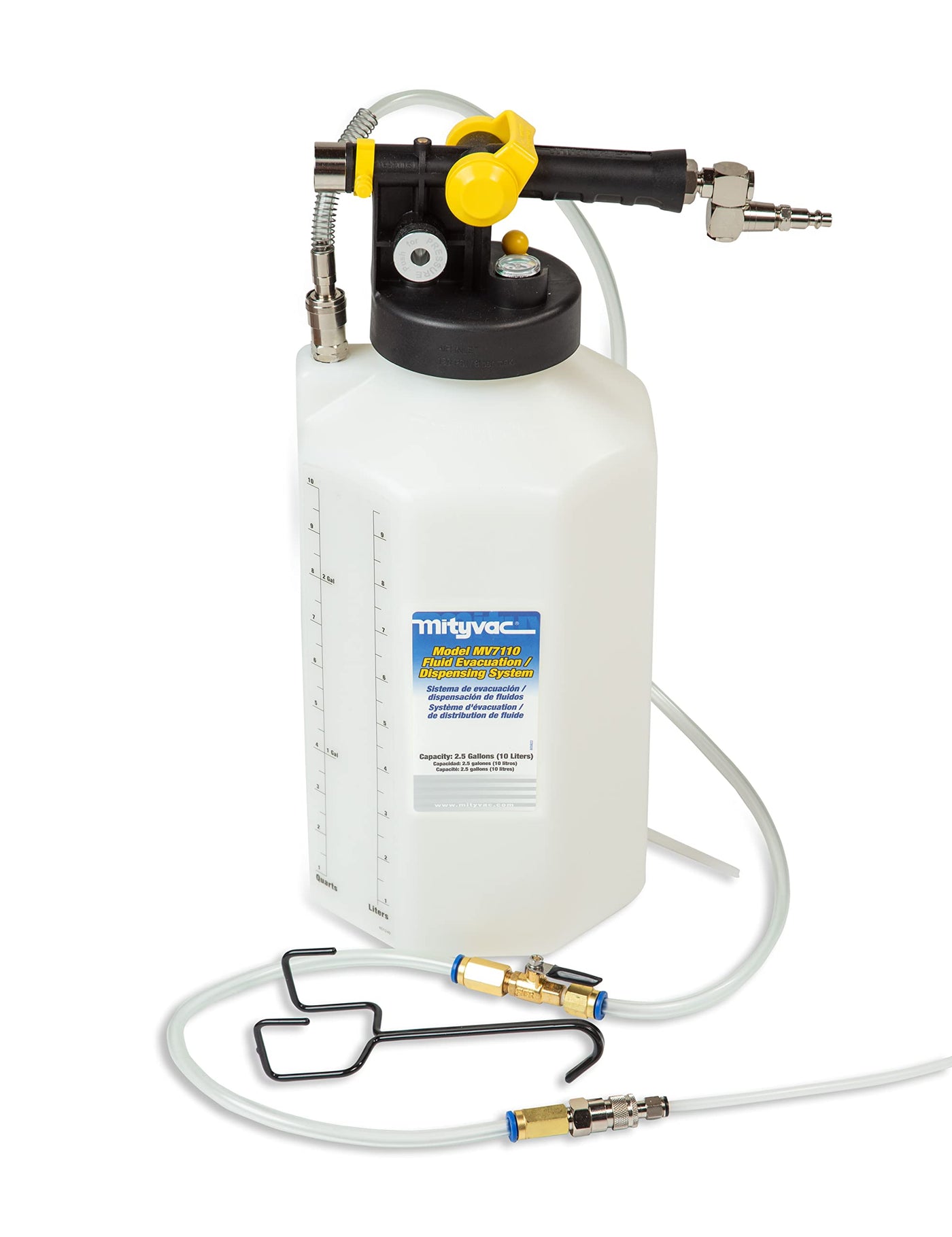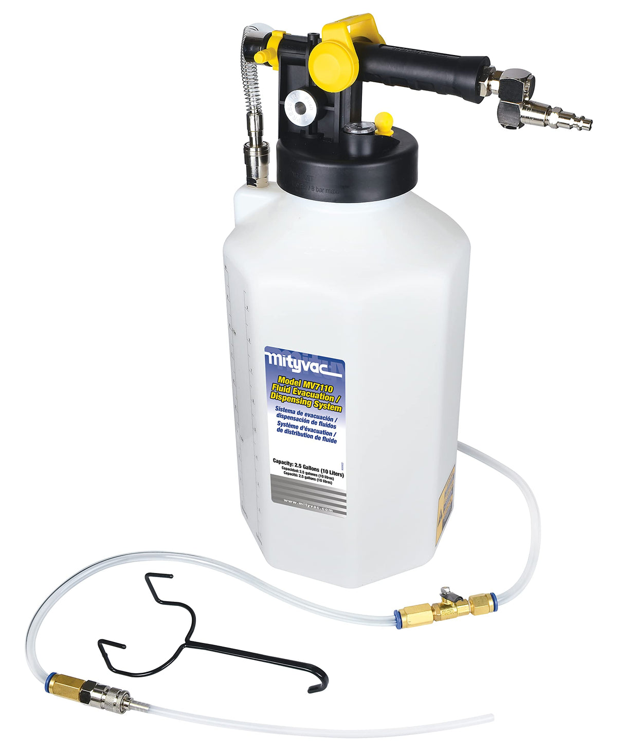 Mityvac Is A Brand Of Vacuum-Related Automotive Diagnostic And Service Repair Tools Since 1971. Beginning With The Design And Patent Of A Single Hand-Held Vacuum Pump Intended For Medical Applications, Its Uses Broadened To Include Automotive Diagnostics And Service As Well As Industrial And Consumer Applications. Mityvac Tools Are Known And Trusted By Professionals Worldwide.Mityvac Mv7110 Pneumatic Fluid Evacuator And Dispenser, 2.5 Gallon (10L), Dispenses And Extracts A Wide Range Of Automotive Used Or New Fluids Including Brake, Windshield Washer, Power Steering And Transmission Fluid, Engine Oil, Gear Oil, And Coolants In Import And Domestic Passenger Vehicles. The Mv7110'S Simplistic Design Is An Effective And Convenient Tool For Evacuating, Topping-Off And Refilling Reservoirs Or Pressure Bleeding Hydraulic Brake And Clutch Systems For Light, Medium And Heavy Duty Agricultural, Commercial, And Industrial Equipment.Easily Switch From Extracting To Dispensing By Switching From Vacuum To Pressure. The Isolated Flow Control And Pressure/Vacuum Switch Valves Provide The Operator With Greater Functionality Control. Our Pneumatic Kit Offers An Overflow Protection Feature To Provide A Safe, Clean, And Time Saving Operation For Increased Productivity.The Mv7110 Kit Includes A 2.5 Gallon (10-Liter) Fluid Reservoir, Reservoir Lid With Integrated Venturi Vacuum And Pressure Dispensing Functions, Fluid Dispensing Hose And Wand And A Hanging Hook.