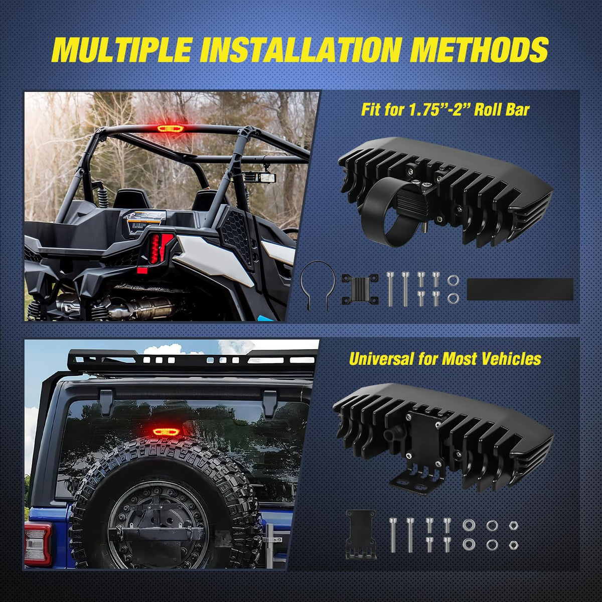 Upgraded Materials And Design: Made of corrosion-resistant 6063 Aluminum profile, with fast heat dissipation capability and effectively extended service life. The unique ''Nilight'' logo design improves the aesthetics of without affecting the lighting effect | Full Modes For Driving: Contains 21pcs red and 9pcs white high-brightness 2835 LEDs, creating 5 high-visibility light modes: running light, brake light, strobe light, reverse light and cargo light. On some trucks, cargo light can also be used as license plate light. Sufficient lighting mode protects your driving | Ready For Install: 2 types of brackets are prepared for use on different vehicles. The round tube bracket is suitable for UTVs and ATVs with 1.75-2inch anti-roll bars. And the