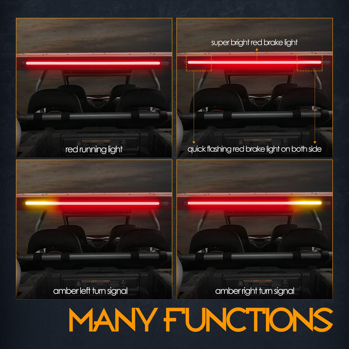Q: How bright is the Nirider 30 Inch UTV tail light?A: The Nirider 30 Inch UTV tail light features 216 high-performance LED chips that provide exceptional brightness, making it visible from a few miles away, ensuring safety during day and night rides.