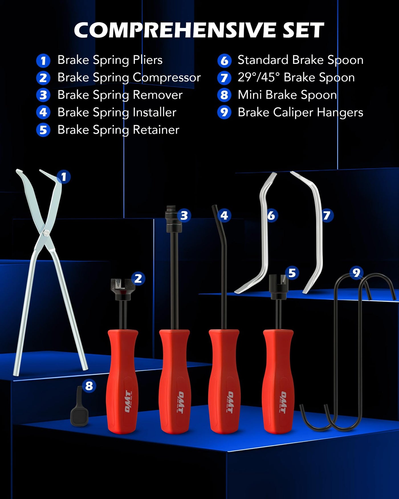 Q: What is included in the Orion Motor Tech 10pc Drum Brake Tool Kit?A: The Orion Motor Tech 10pc Drum Brake Tool Kit includes all necessary accessories for servicing drum brakes, such as pliers, installers, removers, compressors, retainers, hooks, and standard, angled, and mini adjustment spoons.