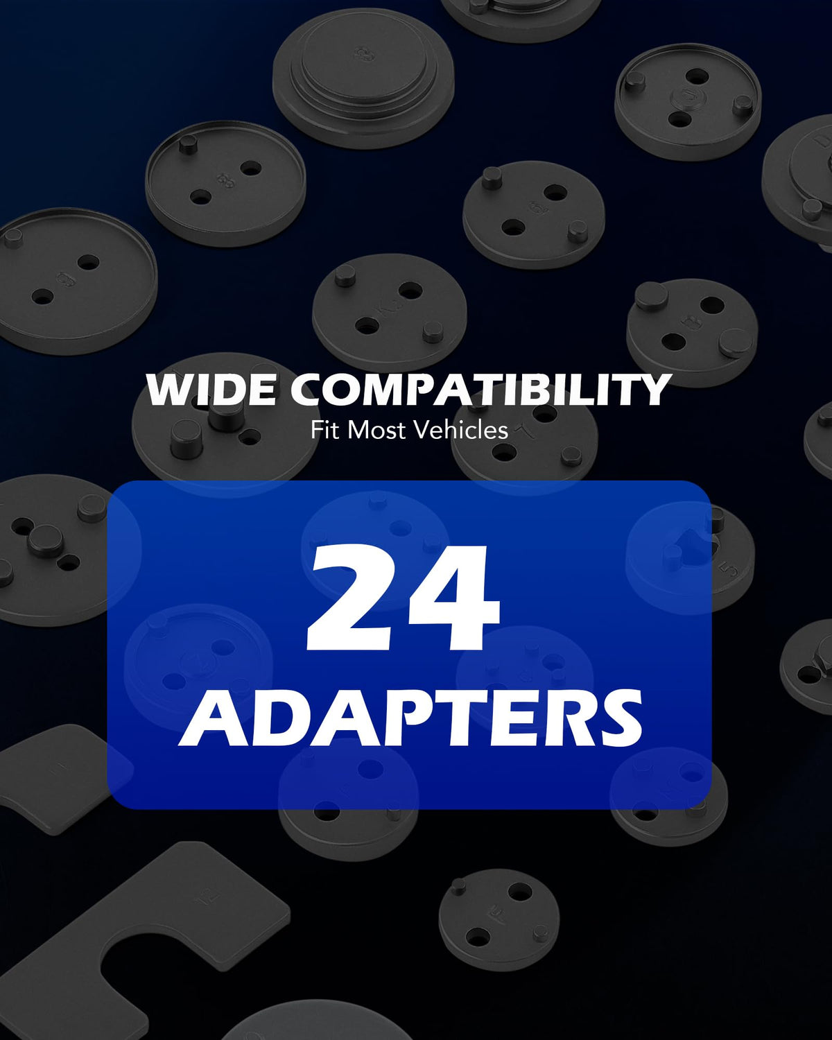 Q: What vehicles are compatible with the Orion Motor Tech Disc Brake Caliper Tool Kit?A: The Orion Motor Tech Disc Brake Caliper Tool Kit includes 24 adapters that fit a wide range of vehicles, including American, European, and Japanese brands. A detailed list of supported vehicles is provided with the product.