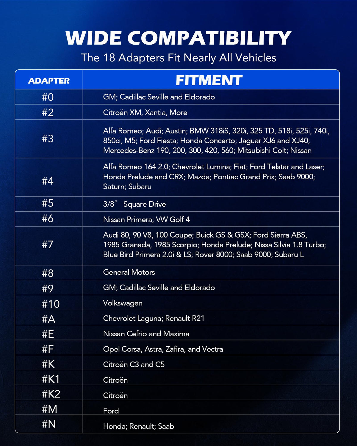 Q: Is the Orion Motor Tech Disc Brake Pad and Caliper Service Tool Kit compatible with all vehicle makes and models?A: Yes, this tool kit is designed for universal compatibility, including 2 retaining plates, left and right thrust bolt assemblies, and 18 adapters to fit hundreds of domestic and import vehicle makes and models.