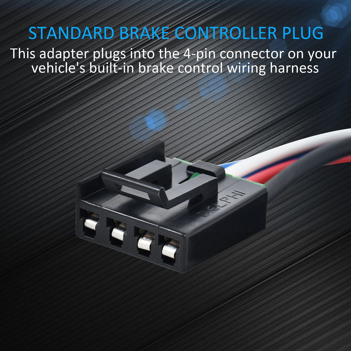 Q: What types of brake controllers can I use with this adapter?A: The adapter features a 4-pin standard plug and is compatible with various brake controllers, including Draw-Tite Activator I, II, III, Tekonsha PowerTrac, Prodigy, P2, P3, Voyager, and REESE Towpower models.