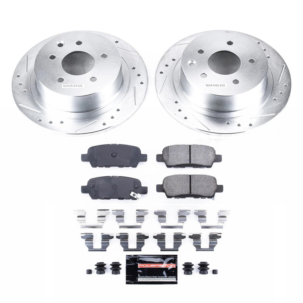Power Stop Z23 Evolution Sport Brake Upgrade Kit makes it simple to increase the braking power of your daily-driver. This Power Stop kit is engineered to provide a low dust & noise-free upgrade over your stock brake system. The Power Stop Z23 brake upgrade kit makes it simple to complete your brake job by including everything you need: perfectly matched drilled & slotted rotors, Z23 Evolution Sport carbon-fiber ceramic brake pads, upgraded hardware, and high performance lubricant. The low-dust ceramic formula brake pads are reinforced with carbon fibers to strengthen the compound. They are dust free, noise-free, and give you increased braking power without sacrificing everyday drivability. The rotors are cast using the finest G3000 metallurgy with strict OE tolerances - making them a perfect, bolt-on upgrade without the need to make any modifications. Precision drill holes allow for maximum rotor cooling. This keeps your brakes temperatures down during extreme operating conditions. Rounded slots help wipe away any gas or debris - keeping a clear contact patch on the rotor surface for safe, smooth braking. Silver Zinc Dichromate plating is applied to all drilled & slotted rotors, they not only look great behind your wheels, but to help prevent rust & corrosion. Get your Power Stop’s Z23 Evolution Sport brake kit and enjoy better, noise-free braking without that nasty brake dust!