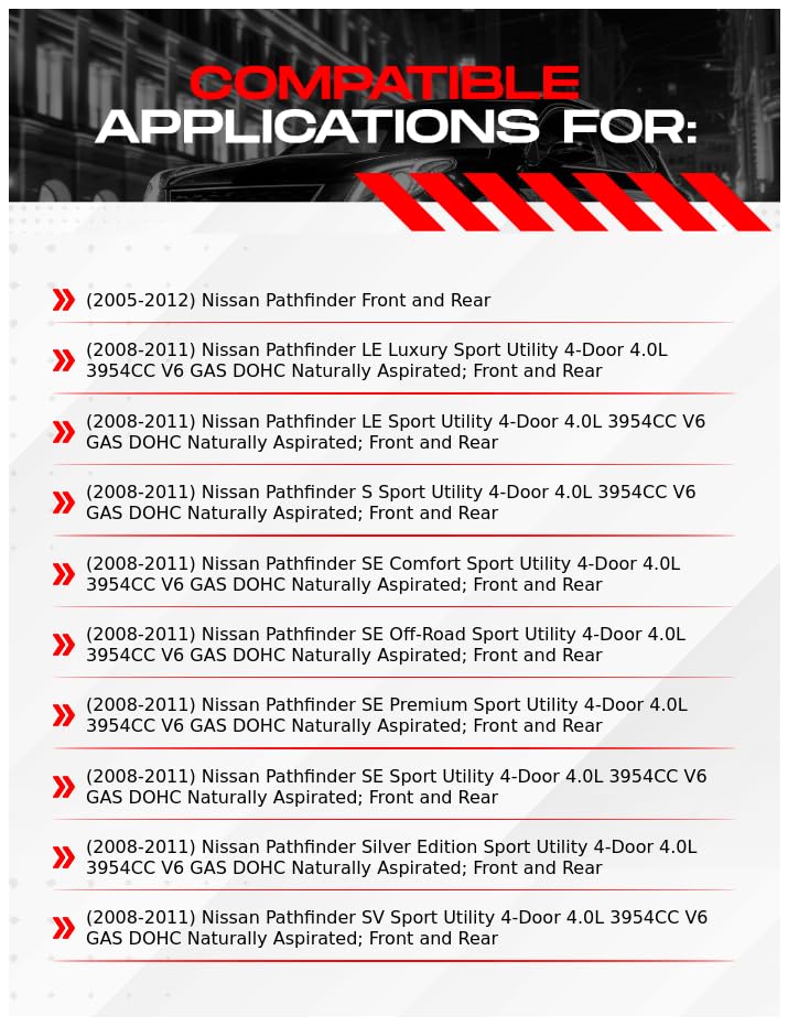 Compatible Applications for:(2005-2012) Nissan Pathfinder Front and Rear(2008-2011) Nissan Pathfinder LE Luxury Sport Utility 4-Door 4.0L 3954CC V6 GAS DOHC Naturally Aspirated; Front and Rear(2008-2011) Nissan Pathfinder LE Sport Utility 4-Door 4.0L 3954CC V6 GAS DOHC Naturally Aspirated; Front and Rear(2008-2011) Nissan Pathfinder S Sport Utility 4-Door 4.0L 3954CC V6 GAS DOHC Naturally Aspirated; Front and Rear(2008-2011) Nissan Pathfinder SE Comfort Sport Utility 4-Door 4.0L 3954CC V6 GAS DOHC Naturally Aspirated; Front and Rear(2008-2011) Nissan Pathfinder SE Off-Road Sport Utility 4-Door 4.0L 3954CC V6 GAS DOHC Naturally Aspirated; Front and Rear(2008-2011) Nissan Pathfinder SE Premium Sport Utility 4-Door 4.0L 3954CC V6 GAS DOHC Naturally Aspirated; Front and Rear(2008-2011) Nissan Pathfinder SE Sport Utility 4-Door 4.0L 3954CC V6 GAS DOHC Naturally Aspirated; Front and Rear(2008-2011) Nissan Pathfinder Silver Edition Sport Utility 4-Door 4.0L 3954CC V6 GAS DOHC Naturally Aspirated; Front and Rear(2008-2011) Nissan Pathfinder SV Sport Utility 4-Door 4.0L 3954CC V6 GAS DOHC Naturally Aspirated; Front and Rear