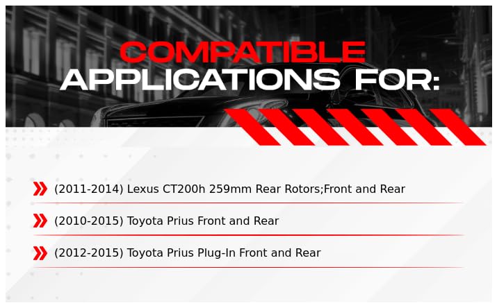 Compatible Applications for:(2011-2014) Lexus CT200h 259mm Rear Rotors;Front and Rear(2010-2015) Toyota Prius Front and Rear(2012-2015) Toyota Prius Plug-In Front and Rear