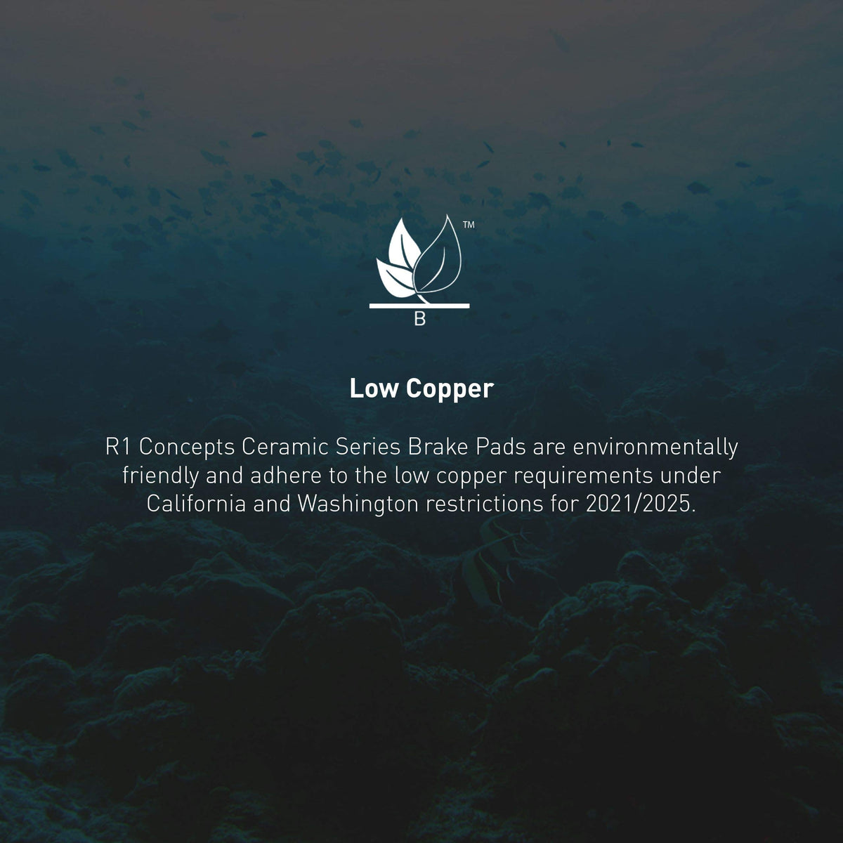 Q: What are the benefits of using ceramic brake pads?A: Ceramic brake pads, like the R1 Concepts model, offer several advantages including low dust production, which helps keep your wheels clean. They are rotor-friendly, promoting longer rotor and pad life, and are made from low copper and 100% asbestos-free materials, making them environmentally friendly.