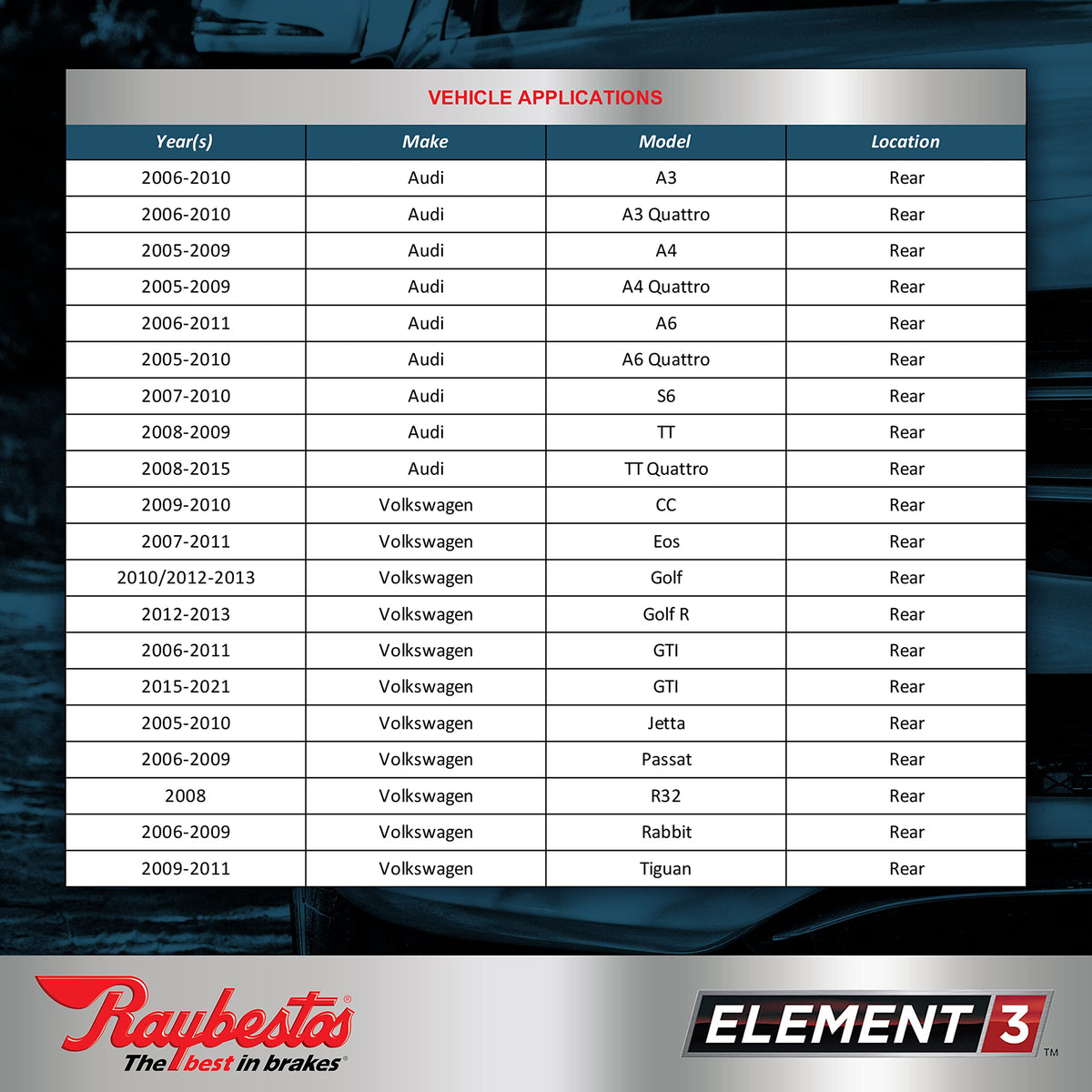 Q: What vehicles are compatible with the Raybestos Element3 EHTTM Replacement Brake Pad Set?A: The Raybestos Element3 EHTTM Replacement Brake Pad Set is compatible with various Audi and Volkswagen models, including the 2006-2010 Audi A3/A3 Quattro, 2005-2009 Audi A4/A4 Quattro, 2006-2011 Audi A6, 2007-2010 Audi S6, and multiple Volkswagen models such as the 2005-2010 Jetta, 2006-2009 Passat, and 2009-2011 Tiguan.