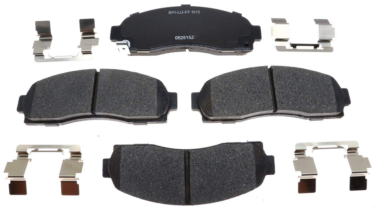 Q: How do the features of these brake pads enhance performance?A: These brake pads feature chamfered and slotted designs that reduce noise and improve stopping power. Additionally, the premium noise damping layered shim helps to minimize sound during braking.