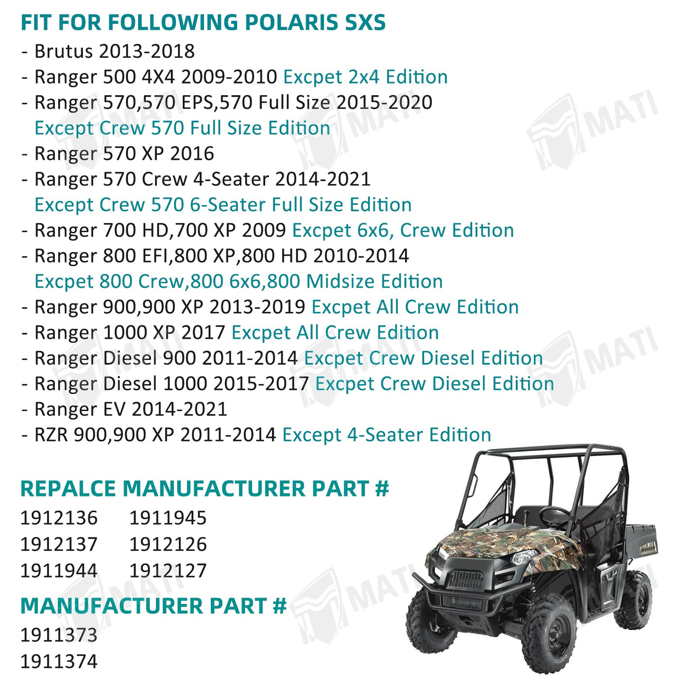Q: What Polaris models are compatible with the Rear Left Right Brake Caliper Assembly?A: The Rear Left Right Brake Caliper Assembly is compatible with several Polaris models, including Ranger 500 4X4 (2009-2010), Ranger Crew 570/570-4 (2014-2021), Ranger 570 Full Size (2015-2020), Ranger 800/800 XP/800 HD (2010-2014), Ranger 900/900 XP (2013-2019), Ranger 900 Diesel (2011-2014), and RZR 900/XP 900 (2011-2014), among others.