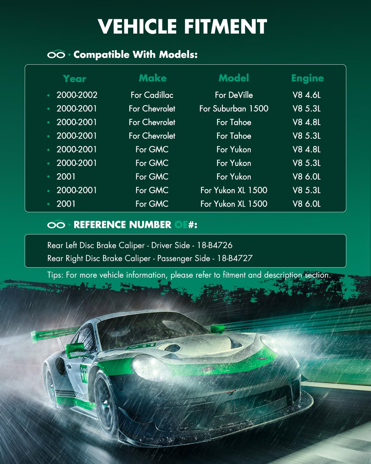 Specification:Placement on Vehicle: Rear Left and Right (Driver and Passenger Side)Brake Calipers:Bracket: withInlet Port Size: M10 x 1.0Bleeder Port Size: M10 x 1.0Piston Size: 2.129inchBrake Piston Count: 1 PistonPiston Material: PhenolicCaliper Finish: Oxygen OxidationInterchange Part Number:Rear Left Disc Brake Caliper - Driver Side - 18-B4726Rear Right Disc Brake Caliper - Passenger Side - 18-B4727Package Includes: 2 x Brake CalipersCompatible with:(For More Details, Please Check ''FITMENT'' in the Upper Left Corner)For Cadillac DeVille 2000-2002For Chevrolet Astro 2003-2005For Chevrolet Avalanche 1500 2002For Chevrolet Silverado 1500 1999-2003For Chevrolet Silverado 1500 HD 2003For Chevrolet Suburban 1500 2000-2002For Chevrolet Tahoe 2000-2002For GMC Safari 2003-2005For GMC Sierra 1500 1999-2003For GMC Yukon 2000-2002
