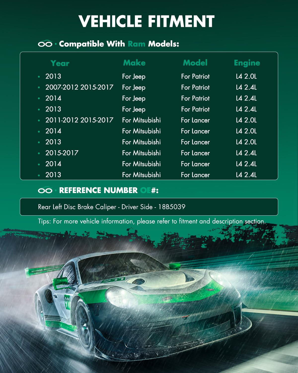 Specification:Placement on Vehicle: Rear Left (Driver Side)Brake Calipers:Bracket: withInlet Port Size: M10 x 1-6HBleeder Port Size: M7 x 1-6HPiston Size: 34.8mmBrake Piston Count: 1 PistonPiston Material: IronCaliper Finish: ZincificationInterchange Part Number: 18B5039Package Includes: 1 x Brake CaliperCompatible with:(For More Details, Please Check ''FITMENT'' in the Upper Left Corner)For Chrysler 200 2011-2014For Chrysler Sebring 2007-2010For Dodge Avenger 2008-2014For Dodge Caliber 2007-2012For Jeep Compass 2007-2017For Jeep Patriot 2007-2017For Mitsubishi Lancer 2008-2017
