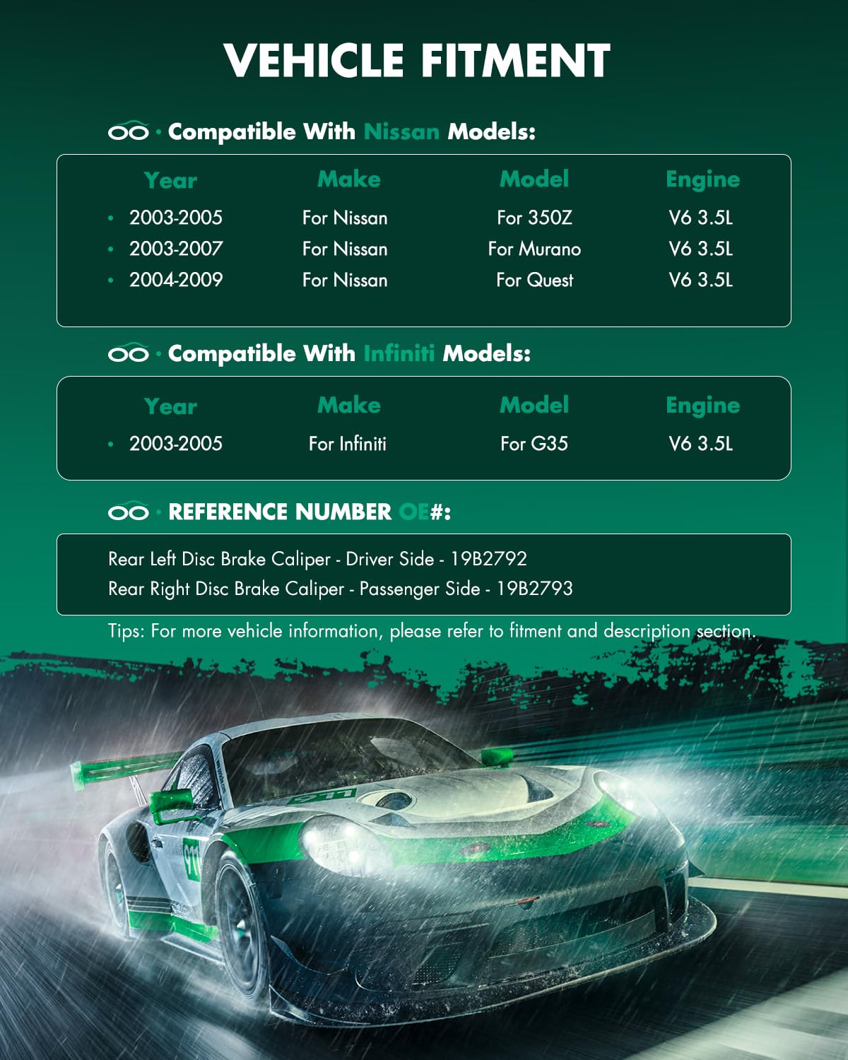 Specification:Placement on Vehicle: Rear Left and Right (Driver and Passenger Side)Brake Calipers:Bracket: withInlet Port Size: M10 x 1.0Bleeder Port Size: M7 x 1.0Piston Size: 42.8mmBrake Piston Count: 1 PistonPiston Material: IronCaliper Finish: ZincificationInterchange Part Number:Rear Left Disc Brake Caliper - Driver Side - 19B2792Rear Right Disc Brake Caliper - Passenger Side - 19B2793Package Includes: 2 x Brake CalipersCompatible with:(For More Details, Please Check ''FITMENT'' in the Upper Left Corner)For Infiniti G35 Base Coupe 2-Door 3.5L 2003-2004For Infiniti G35 Base Sedan 4-Door 3.5L 2003-2004For Infiniti G35 X Sedan 4-Door 3.5L 2004-2005For Nissan 350Z Base Coupe 2-Door 3.5L 2003-2005For Nissan 350Z Enthusiast Convertible 2-Door 3.5L 2004-2005For Nissan 350Z Enthusiast Coupe 2-Door 3.5L 2003-2005For Nissan 350Z Grand Touring Convertible 2-Door 3.5L 2005For Nissan 350Z Performance Coupe 2-Door 3.5L 2003-2005For Nissan 350Z Touring Convertible 2-Door 3.5L 2004-2005For Nissan 350Z Touring Coupe 2-Door 3.5L 2003-2005For Nissan 350Z Track Coupe 2-Door 3.5L 2003-2005For Nissan Murano S Sport Utility 4-Door 3.5L 2005-2007For Nissan Murano SE Sport Utility 4-Door 3.5L 2003-2007For Nissan Murano SL Sport Utility 4-Door 3.5L 2003-2007For Nissan Quest Base Mini Passenger Van 4-Door 3.5L 2005-2009For Nissan Quest S Mini Passenger Van 4-Door 3.5L 2004-2009For Nissan Quest SE Mini Passenger Van 4-Door 3.5L 2004-2009For Nissan Quest SL Mini Passenger Van 4-Door 3.5L 2004-2009