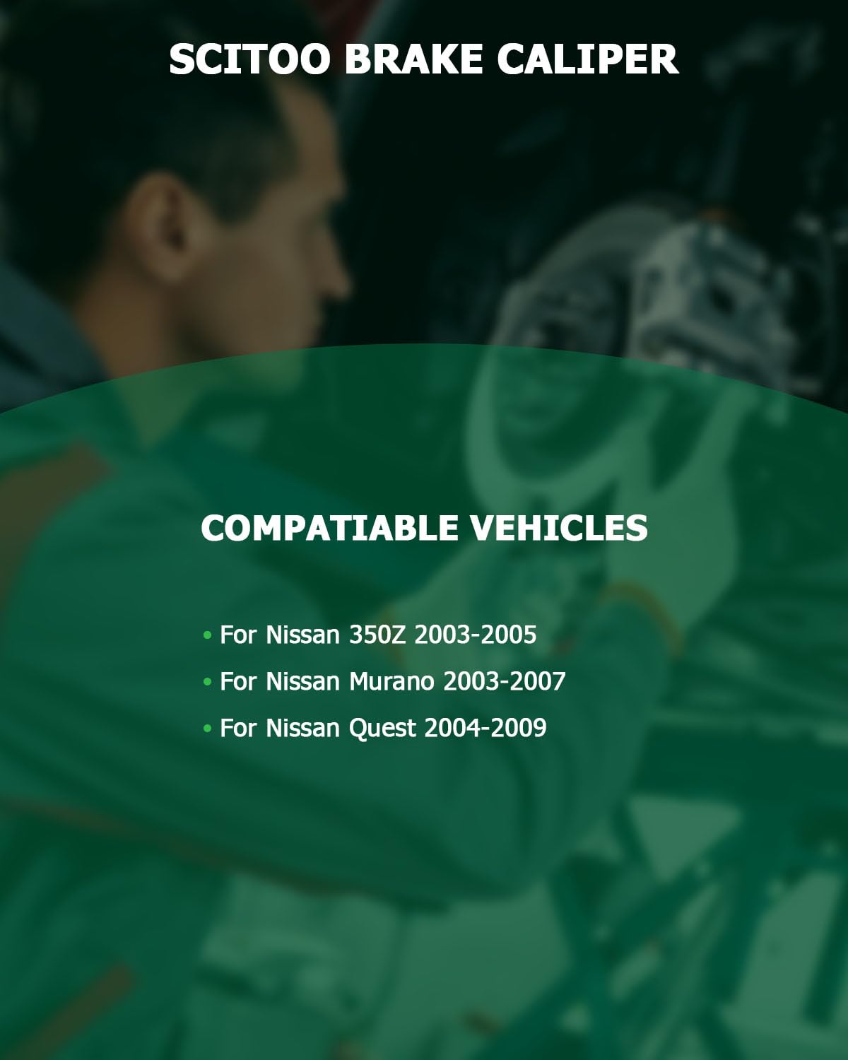 Specification:Placement on Vehicle: Rear Right (Passenger Side)Brake Calipers:Bracket: withInlet Port Size: M10 x 1.0Bleeder Port Size: M7 x 1.0Piston Size: 42.8mmBrake Piston Count: 1 PistonPiston Material: IronCaliper Finish: ZincificationInterchange Part Number: 19B2793Package Includes: 1 x Brake CaliperCompatible with:(For More Details, Please Check ''FITMENT'' in the Upper Left Corner)For Infiniti G35 Base Coupe 2-Door 3.5L 2003-2005For Infiniti G35 Base Sedan 4-Door 3.5L 2003-2005For Infiniti G35 X Sedan 4-Door 3.5L 2004-2005For Nissan 350Z Base Coupe 2-Door 3.5L 2003-2005For Nissan 350Z Enthusiast Convertible 2-Door 3.5L 2004-2005For Nissan 350Z Enthusiast Coupe 2-Door 3.5L 2003-2005For Nissan 350Z Grand Touring Convertible 2-Door 3.5L 2005For Nissan 350Z Performance Coupe 2-Door 3.5L 2003-2005For Nissan 350Z Touring Convertible 2-Door 3.5L 2004-2005For Nissan 350Z Touring Coupe 2-Door 3.5L 2003-2005For Nissan 350Z Track Coupe 2-Door 3.5L 2003-2005For Nissan Murano S Sport Utility 4-Door 3.5L 2005-2007For Nissan Murano SE Sport Utility 4-Door 3.5L 2003-2007For Nissan Murano SL Sport Utility 4-Door 3.5L 2003-2007For Nissan Quest Base Mini Passenger Van 4-Door 3.5L 2005-2009For Nissan Quest S Mini Passenger Van 4-Door 3.5L 2004-2009For Nissan Quest SE Mini Passenger Van 4-Door 3.5L 2004-2009For Nissan Quest SL Mini Passenger Van 4-Door 3.5L 2004-2009For Nissan Quest SLT Mini Passenger Van 4-Door 3.5L 2009