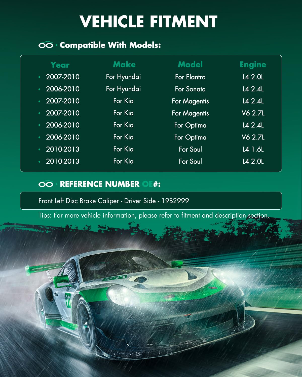 Specification:Placement on Vehicle: Front Left (Driver Side)Brake Calipers:Bracket: withInlet Port Size: M10 x 1.0-6HBleeder Port Size: M10 x 1.0-6HPiston Size: 57mmBrake Piston Count: 1 PistonPiston Material: IronCaliper Finish: ZincificationInterchange Part Number: 19B2999Package Includes: 1 x Brake CaliperCompatible with:(For More Details, Please Check ''FITMENT'' in the Upper Left Corner)For Hyundai 2006-2010For Kia 2006-2013