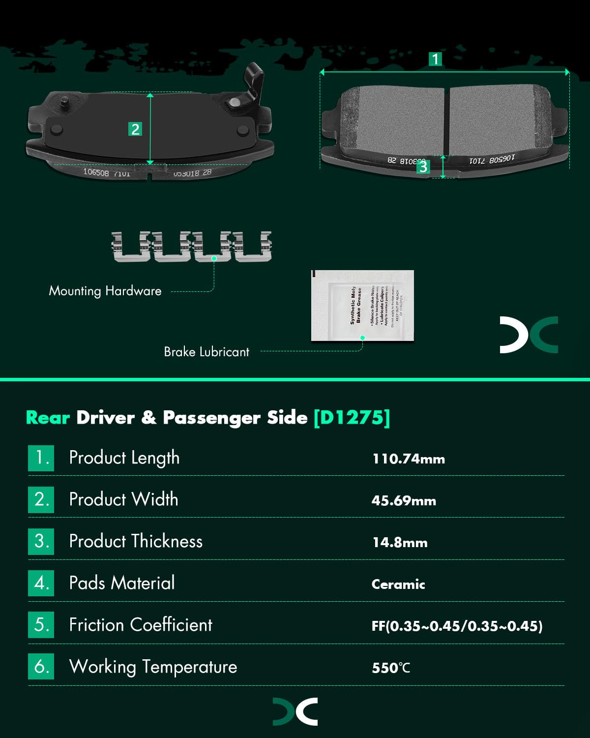 Features: ?Low Dust Braking?Quiet Operation?Increased Brake Power?Long Service Life?Easy InstallationSPECIFICATIONS: ?Placement on Vehicle: Front Rear Left Right?Pad Compound: Ceramic Low Dust FormulaOEM PART NUMBER(S): 4 X Front Ceramic Brake Pads - D1125-83064 X Rear Ceramic Brake Pads - ATD1275C,D1275-8391Package contains: 8 Ceramic PadsFitment: For Chevrolet Equinox L Sport Utility 4-Door 2015-2017For Chevrolet Equinox LS Sport Utility 4-Door 2010-2017For Chevrolet Equinox LT Sport Utility 4-Door 2010-2017For Chevrolet Equinox LTZ Sport Utility 4-Door 2010-2016For Chevrolet Equinox Premier Sport Utility 4-Door 2017For GMC Terrain Denali Sport Utility 4-Door 2013-2017For GMC Terrain SL Sport Utility 4-Door 2015-2017For GMC Terrain SLE Sport Utility 4-Door 2010-2017For GMC Terrain SLT Sport Utility 4-Door 2010-2017