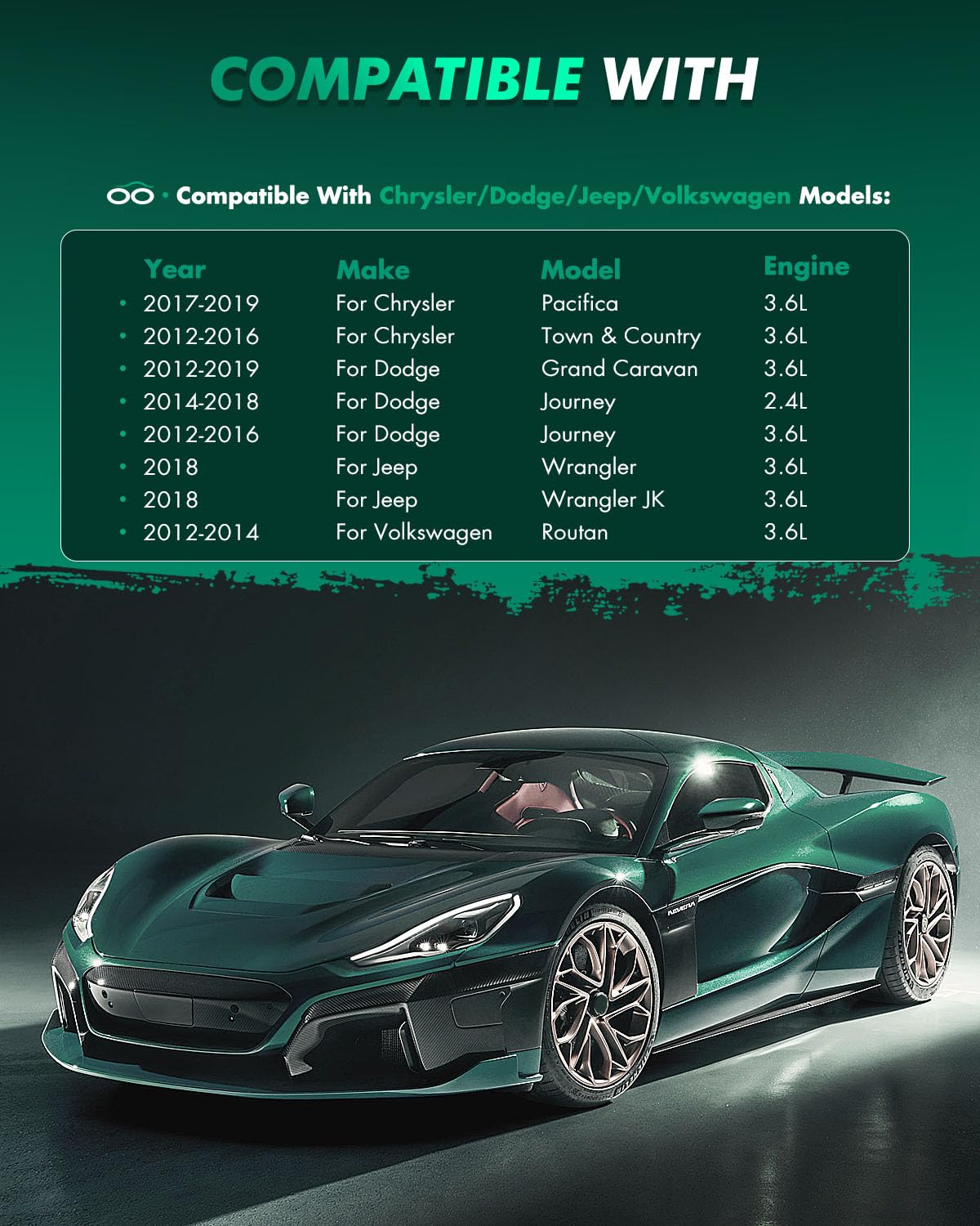 Fit For:2017-2019 For Chrysler Pacifica 3.6L2012-2016 For Chrysler Town & Country 3.6L2012-2019 For Dodge Grand Caravan 3.6L2014-2018 For Dodge Journey 2.4L2012-2016 For Dodge Journey 3.6L2018 For Jeep Wrangler 3.6L2018 For Jeep Wrangler JK 3.6L2012-2014 For Volkswagen For Routan 3.6LSpecifications:Placement on Vehicle: Front Left RightPad Compound: Semi-MetalOEM PART NUMBER(S):4 x Front Brake Pads - D1589-8800Package contains:4 x Brake Pads