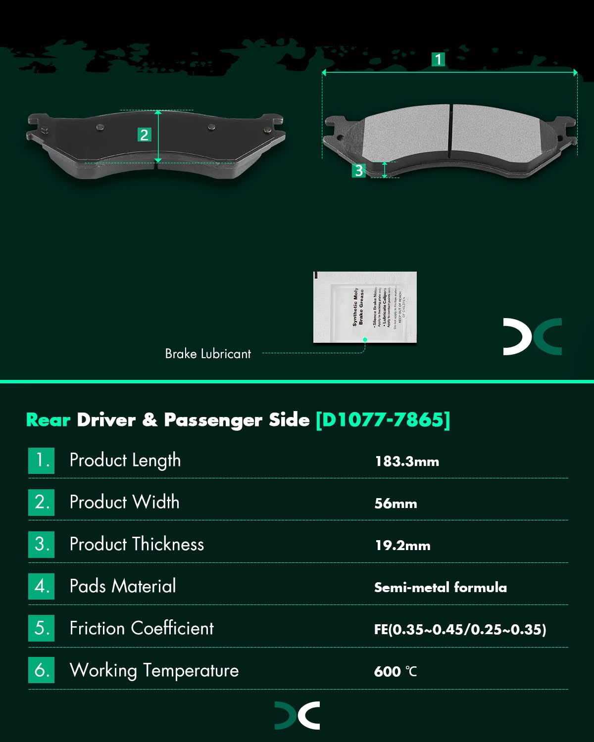 Compatible Vehicles - For Dodge For Ram 1500 2004 2005 2006 2007 2008,For Dodge For Ram 2500 2003 2004 2005 2006 2007 2008,For Dodge For Ram 3500 2003 2004 2005 2006 2007 2008 | Specification ---- D1077-7865 Rear Pads -- Thickness of Friction Material: 19.2 mm;Friction coefficient: FE(0.35~0.45/0.25~0.35);Tolerant Temperature: 600?;Brake Pads Thickness: 53.4mm;Product length: 183.3mm;Product width: 56mm | Feature - 4 x Brake Pads Design to further reduce brake noise and increase 20% more braking power | Ultra Durable Quality - Our Brake Pads Kits accessories are made of extremely durable materials and work well without sacrificing functionality | Buyer Notice - Please check picture,part number and fitment information to verify if this is the correct one you need before purchasing.Please get in touch with us at any time if the product has any issues.We offer a wide variety of Brake Pads/Brake Rotors/Brakes Kits, so there's one to match your car