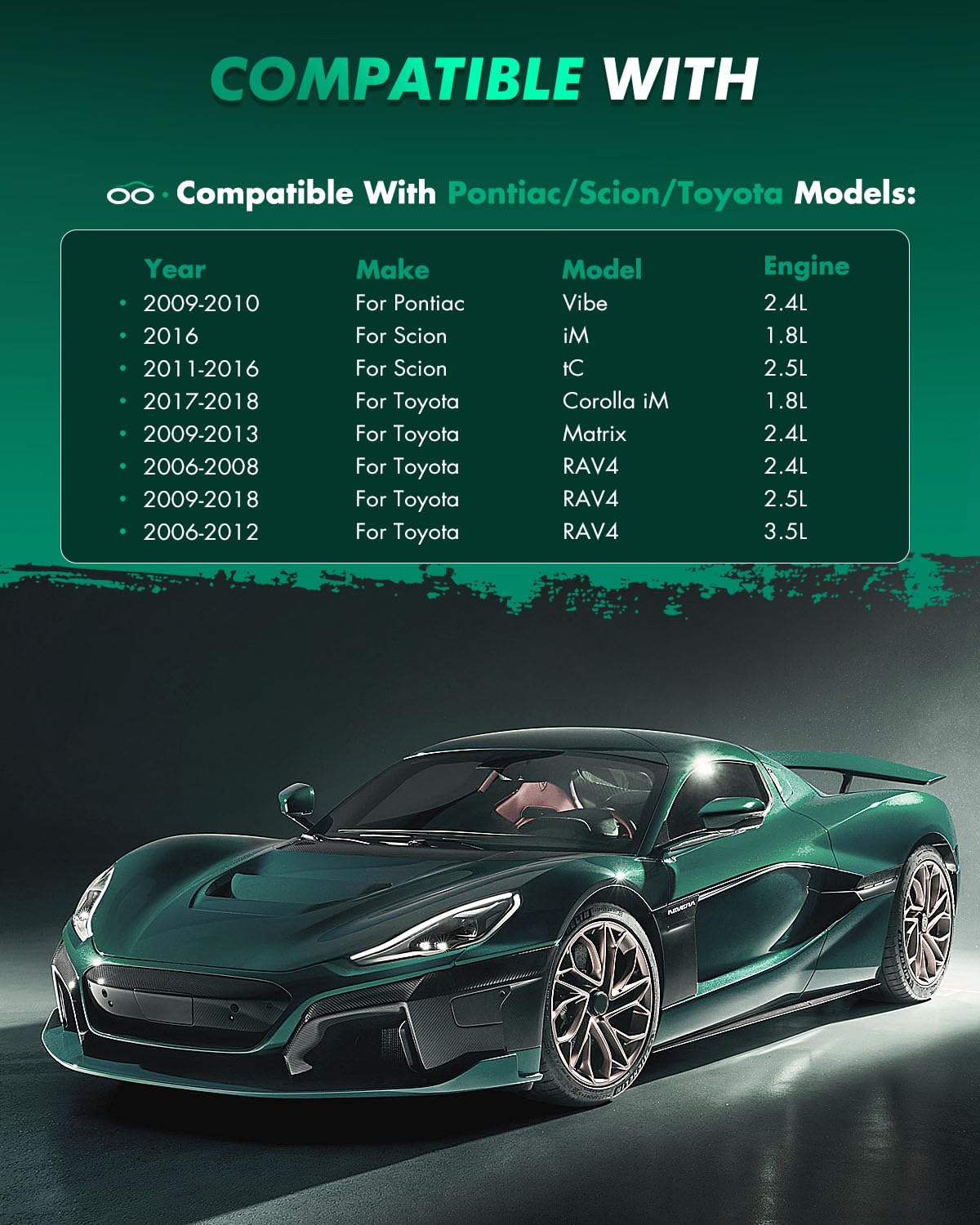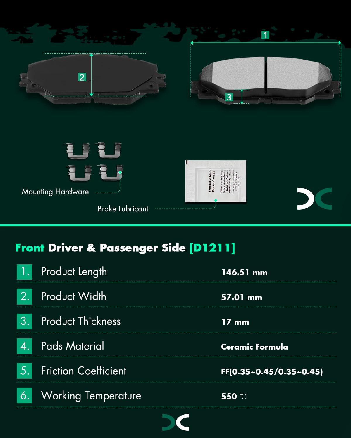 Compatible Vehicles - For Pontiac For Vibe 2009 2010,For Scion For iM 2016,For Scion For tC 2011 2012 2013 2014 2015 2016,For Toyota For Corolla iM 2017 2018,For Toyota For Matrix 2009 2010 2011 2012 2013,For Toyota For RAV4 2006 2007 2008 2009 2010 2011 2012 2013 2014 2015 2016 2017 2018 | Specification ---- D1211-8331 Front Pads -- Thickness of Friction Material: 17 mm;Friction coefficient: FF(0.35~0.45/0.35~0.45);Tolerant Temperature: 550?;Brake Pads Thickness: 51.6mm;Product length: 146.51mm;Product width: 57.01mm | Feature - 4 x Brake Pads Design to further reduce brake noise and increase 20% more braking power | Ultra Durable Quality - Our Brake Pads Kits accessories are made of extremely durable materials and work well without sacrificing functionality | Buyer Notice - Please check picture,part number and fitment information to verify if this is the correct one you need before purchasing.Please get in touch with us at any time if the product has any issues.We offer a wide variety of Brake Pads/Brake Rotors/Brakes Kits, so there's one to match your car