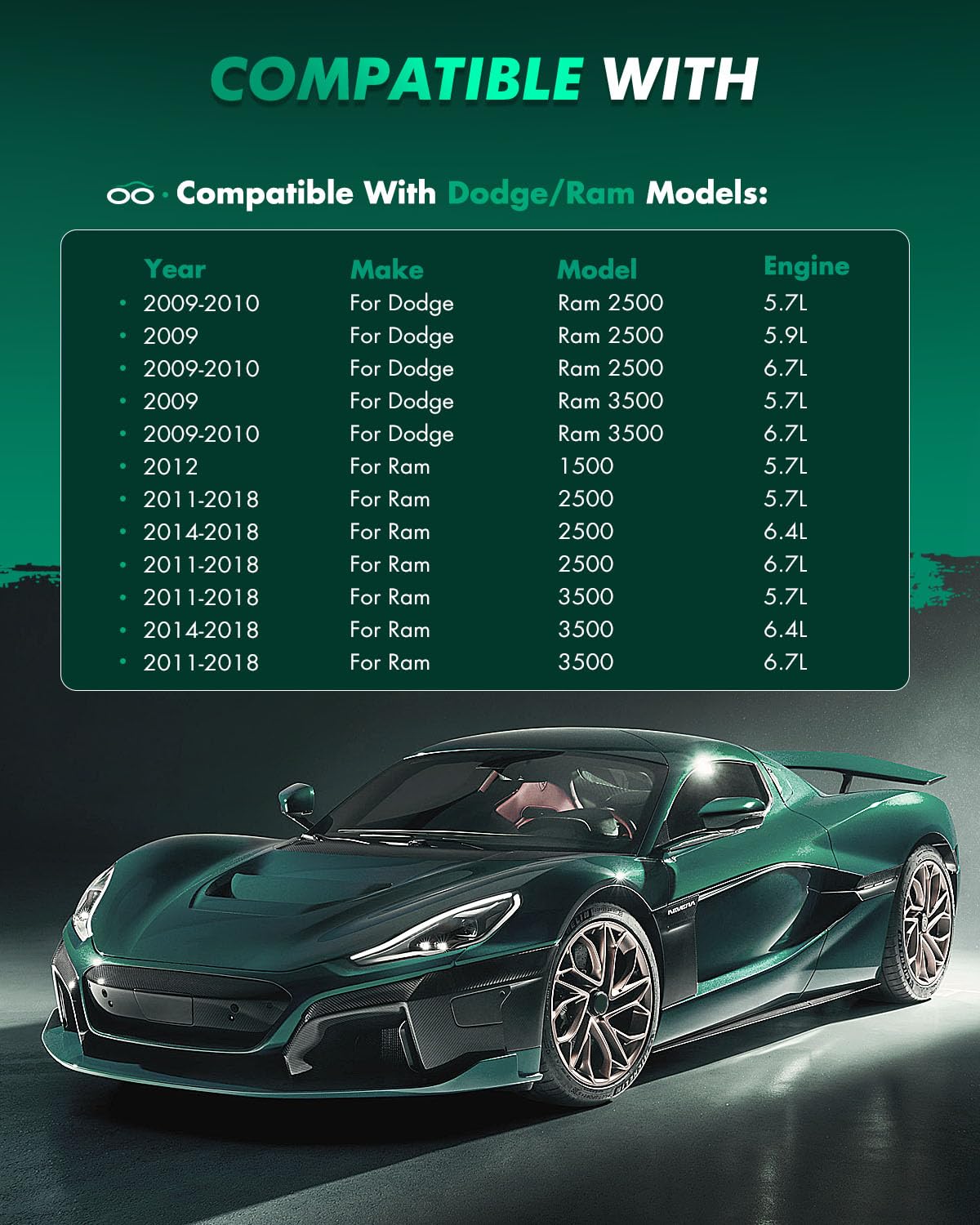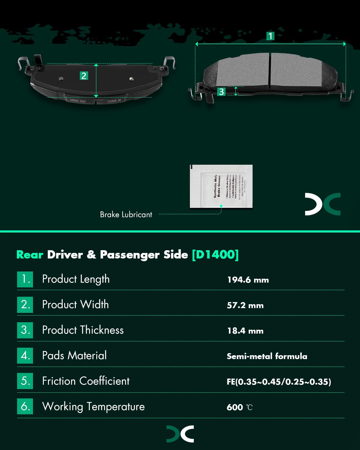 Compatible Vehicles - For Dodge For Ram 2500 2009 2010,For Dodge For Ram 3500 2009 2010,For Ram For 1500 2012,For Ram For 2500 2011 2012 2013 2014 2015 2016 2017 2018,For Ram For 3500 2011 2012 2013 2014 2015 2016 2017 2018 | Specification ---- D1400-8508 Rear Pads -- Thickness of Friction Material: 18.4 mm;Friction coefficient: FE(0.35~0.45/0.25~0.35);Tolerant Temperature: 600?;Brake Pads Thickness: 53.1mm;Product length: 194.6mm;Product width: 57.2mm | Feature - 4 x Brake Pads Design to further reduce brake noise and increase 20% more braking power | Ultra Durable Quality - Our Brake Pads Kits accessories are made of extremely durable materials and work well without sacrificing functionality | Buyer Notice - Please check picture,part number and fitment information to verify if this is the correct one you need before purchasing.Please get in touch with us at any time if the product has any issues.We offer a wide variety of Brake Pads/Brake Rotors/Brakes Kits, so there's one to match your car