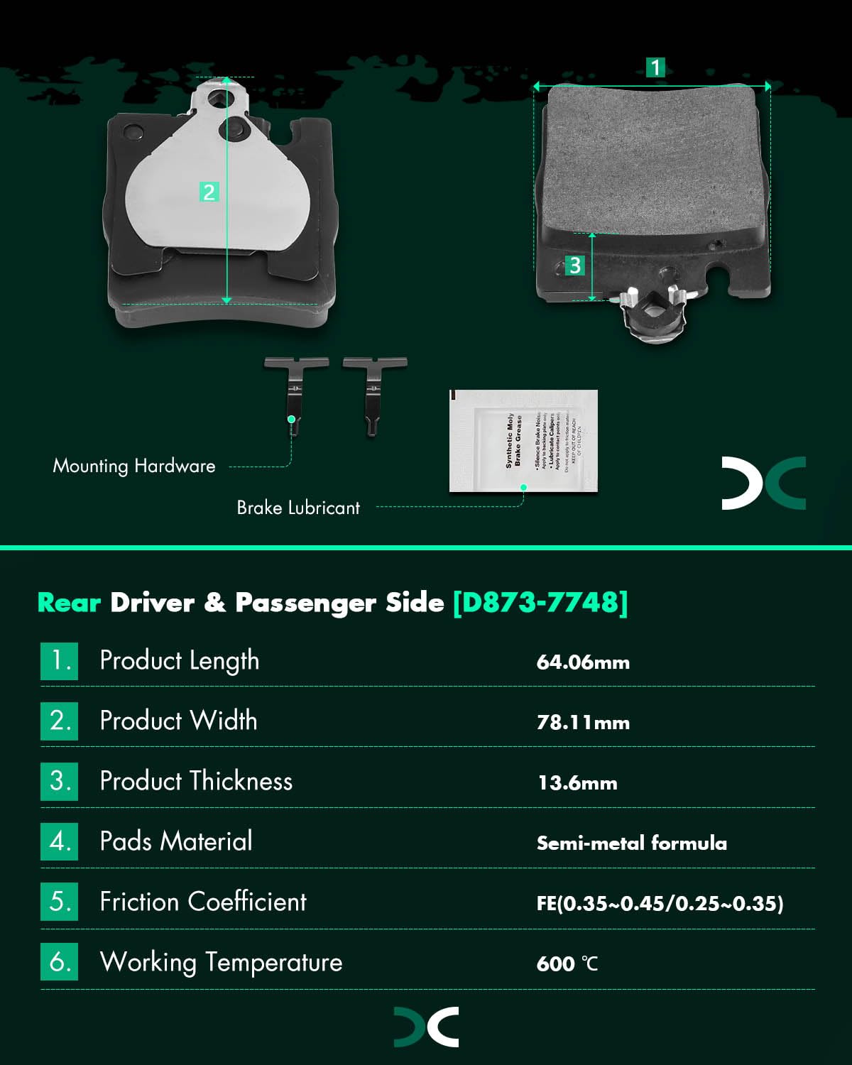 Compatible Vehicles - For Mercedes-Benz For C230 2003 2004 2005 2006 2007,For Mercedes-Benz For C240 2003 2004 2005,For Mercedes-Benz For C280 2006 2007,For Mercedes-Benz For C320 2001 2002 2003 2004 2005,For Mercedes-Benz For C350 2006 2007,For Mercedes-Benz For CLK320 2000 2001 2002 2003 2004 2005,For Mercedes-Benz For CLK350 2006 2007 2008 2009,For Mercedes-Benz For CLK430 2001 2002 2003,For Mercedes-Benz For E320 1996 1997 1998 1999 2000 2001 2002 | Specification ---- D873-7748 Rear Pads -- Thickness of Friction Material: 13.6 mm;Friction coefficient: FE(0.35~0.45/0.25~0.35);Tolerant Temperature: 600?;Brake Pads Thickness: 52.7mm;Product length: 64.06mm;Product width: 78.11mm | Feature - 4 x Brake Pads Design to further reduce brake noise and increase 20% more braking power | Ultra Durable Quality - Our Brake Pads Kits accessories are made of extremely durable materials and work well without sacrificing functionality | Buyer Notice - Please check picture,part number and fitment information to verify if this is the correct one you need before purchasing.Please get in touch with us at any time if the product has any issues.We offer a wide variety of Brake Pads/Brake Rotors/Brakes Kits, so there's one to match your car