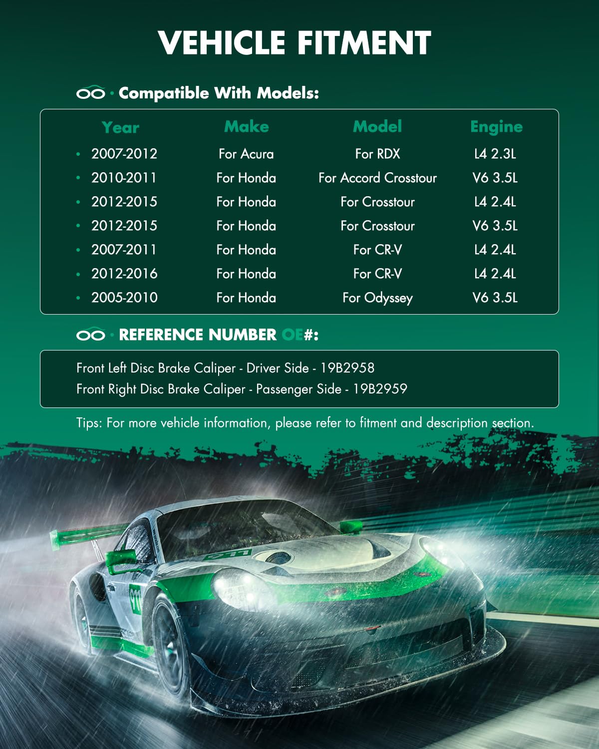 Brake Calipers: Bracket: withInlet Port Size: M10X1-6HBleeder Port Size: M10X1-6HPiston Size: 45mmBrake Piston Count: 2PistonPiston Material: IronCaliper Finish: Zinc PlatedInterchange Part Number: Front Left Disc Brake Caliper - Driver Side - 19B2958Front Right Disc Brake Caliper - Passenger Side - 19B2959Package Includes: 2 x Brake CalipersCompatible with: 2007-2012 For Acura RDX 2.3L2010-2011 For Honda Accord Crosstour 3.5L2012-2015 For Honda Crosstour 2.4L2012-2015 For Honda Crosstour 3.5L2007-2016 For Honda CR-V 2.4L2005-2010 For Honda Odyssey 3.5L