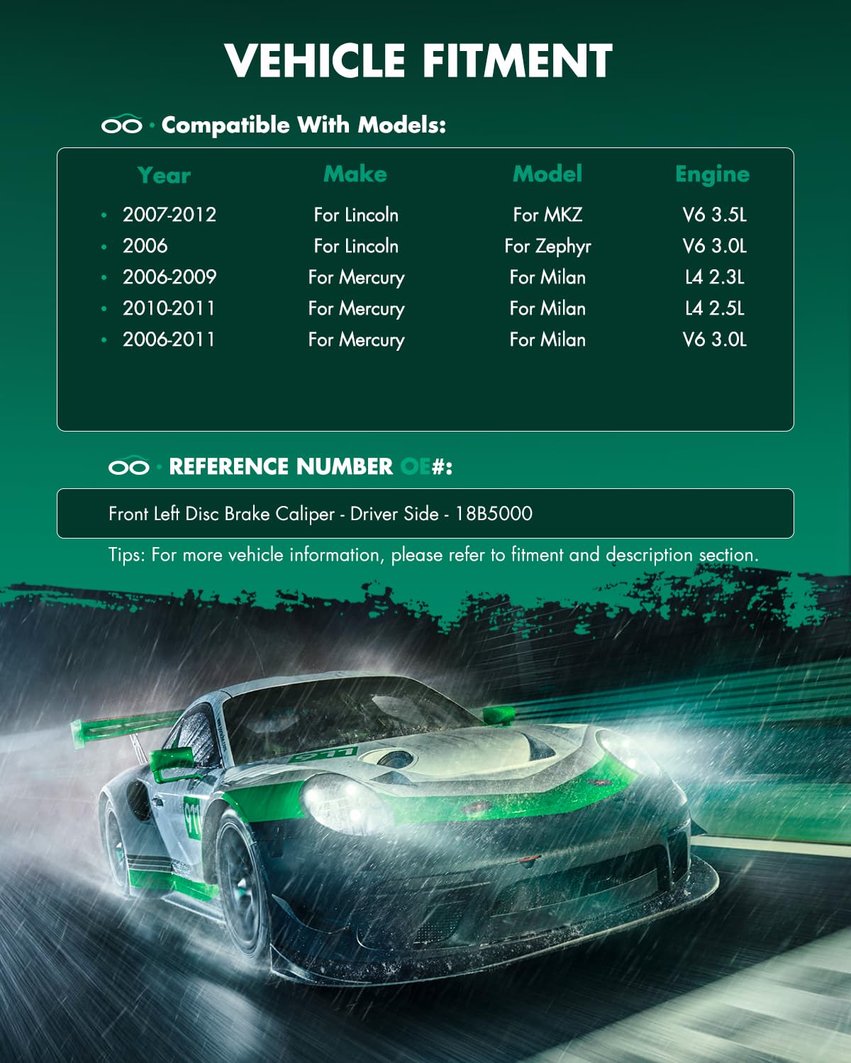 Specification:Placement on Vehicle: Front Left (Driver Side)Brake Calipers:Bracket: withInlet Port Size: M10 x 1.0-6HBleeder Port Size: 5/16-24_UNFPiston Size: 57mmBrake Piston Count: 1 PistonPiston Material: IronCaliper Finish: ZincificationInterchange Part Number: 18B5000Package Includes: 1 x Brake CaliperCompatible with:(For More Details, Please Check ''FITMENT'' in the Upper Left Corner)ForFord 2006-2012,For Lincoln 2006-2012,For Mazda 2006-2013,For Mercury 2006-2011