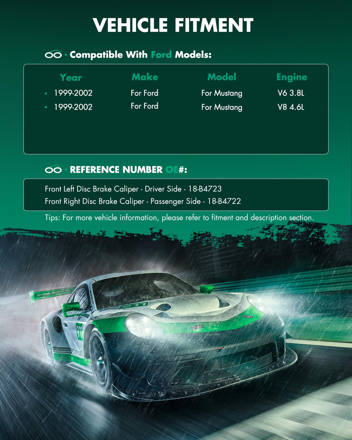 Specification:Placement on Vehicle: Front Left and Right (Driver and Passenger Side)Brake Calipers:Bracket: withInlet Port Size: M10 x 1.0Bleeder Port Size: M10 x 1.0Piston Size: 1.772inchBrake Piston Count: 2 PistonPiston Material: PhenolicCaliper Finish: Red SprayInterchange Part Number:Front Left Disc Brake Caliper - Driver Side - 18-B4723Front Right Disc Brake Caliper - Passenger Side - 18-B4722Package Includes: 2 x Brake CalipersCompatible with:(For More Details, Please Check ''FITMENT'' in the Upper Left Corner)For Ford For Mustang Base Convertible 2-Door 3.8L 1999-2002For Ford For Mustang Base Coupe 2-Door 3.8L 1999-2002For Ford For Mustang GT Convertible 2-Door 4.6L 1999-2002For Ford For Mustang GT Coupe 2-Door 4.6L 1999-2002