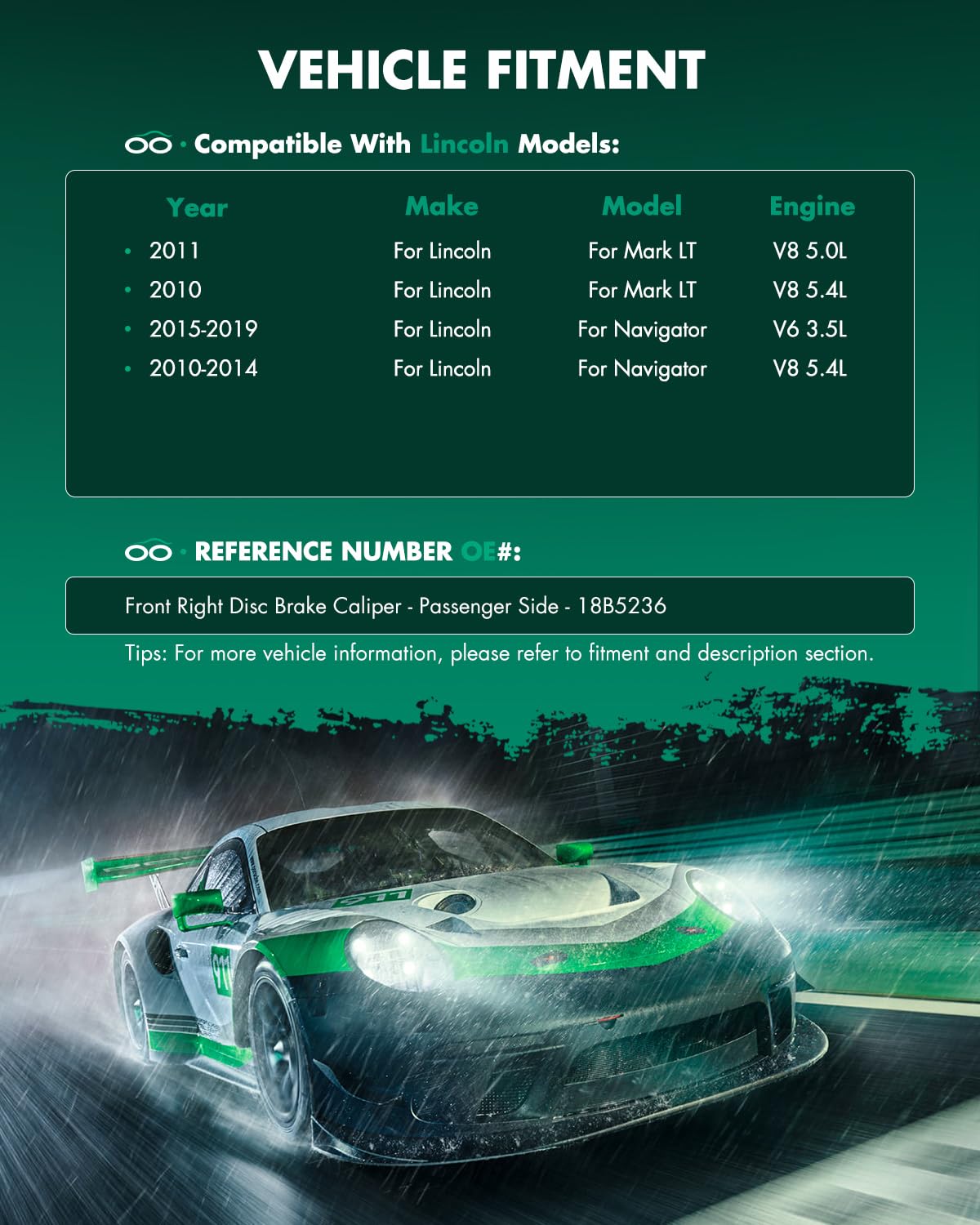 Specification:Placement on Vehicle: Front Right (Passenger Side)Brake Calipers:Bracket: withInlet Port Size: 3/8 x 24Bleeder Port Size: 3/8 x 24Piston Size: 54mmBrake Piston Count: 2 PistonPiston Material: PhenolicCaliper Finish: ZincificationInterchange Part Number: 18B5236Package Includes: 1 x Brake CaliperCompatible with:(For More Details, Please Check ''FITMENT'' in the Upper Left Corner)For Ford For Expedition 2010-2016For Ford For F-150 2010-2011For Lincoln Navigator 2010-2016