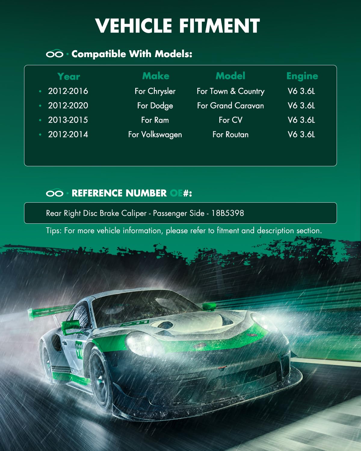 Specification: Placement on Vehicle: Rear Right (Passenger Side)Brake Calipers: Bracket: withInlet Port Size: M10*1.0Bleeder Port Size: M10*1.0Piston Size: 45.4mmBrake Piston Count: 1 PistonPiston Material: Cast IronCaliper Finish: ZincificationInterchange Part Number: 18B5398Package Includes: 1 x Brake CaliperCompatible with: For Chrysler Town & Country 3.6L 2012-2016For Dodge Grand Caravan 3.6L 2012-2020For Ram C/V 3.6L 2013-2015For Volkswagen For Routan 3.6L 2012-2014