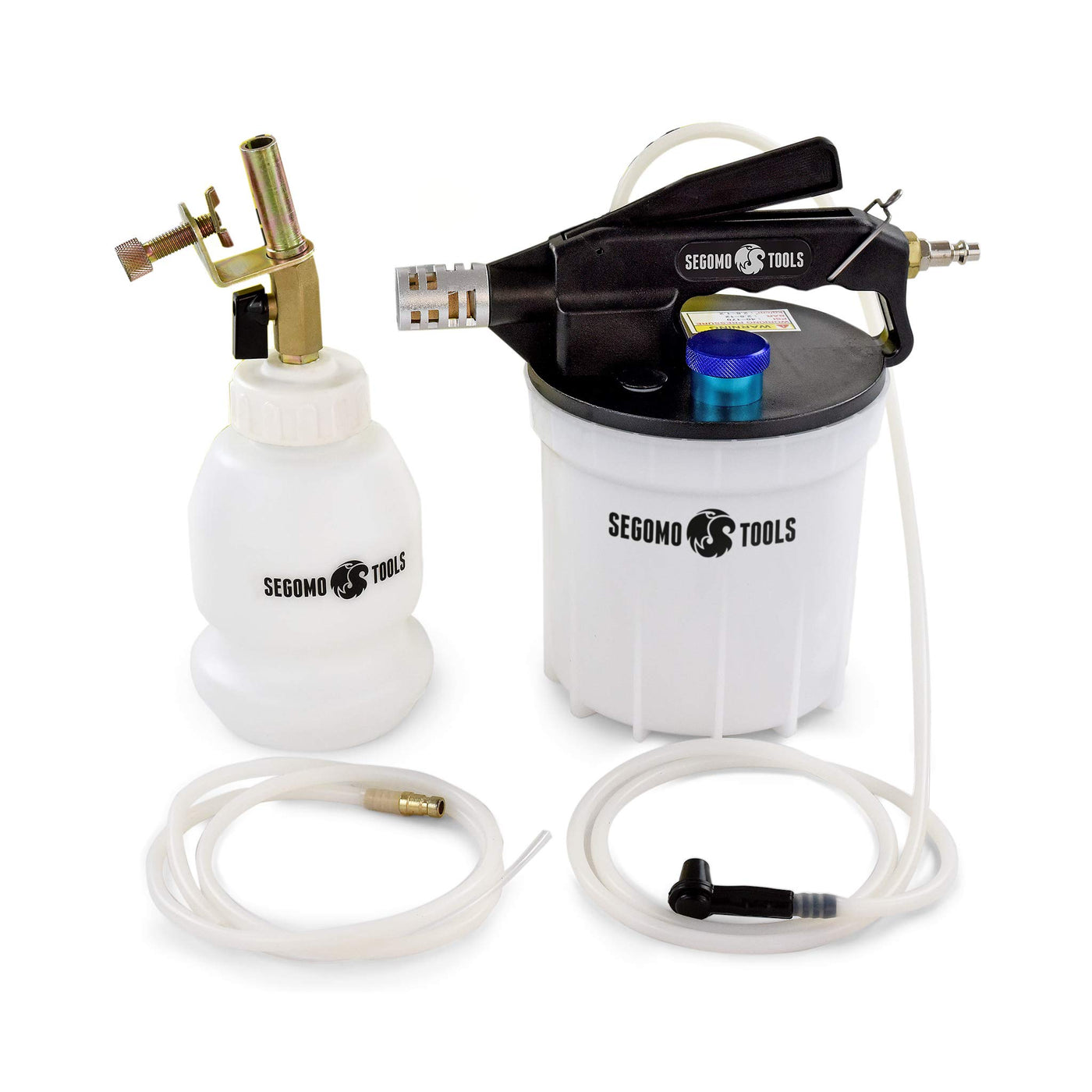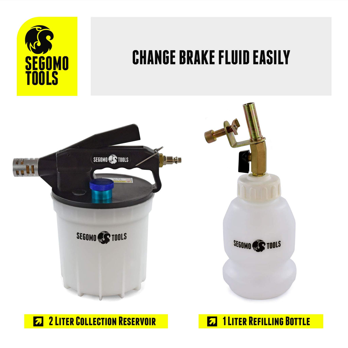 Q: How does the Segomo Tools Vacuum Brake Bleeder work?A: The Segomo Tools Vacuum Brake Bleeder utilizes a vacuum system to efficiently bleed, flush, and drain brake and clutch fluid from standard and ABS hydraulic systems without causing spillage. It features a large 2-liter collection reservoir that allows for easy and mess-free operation.