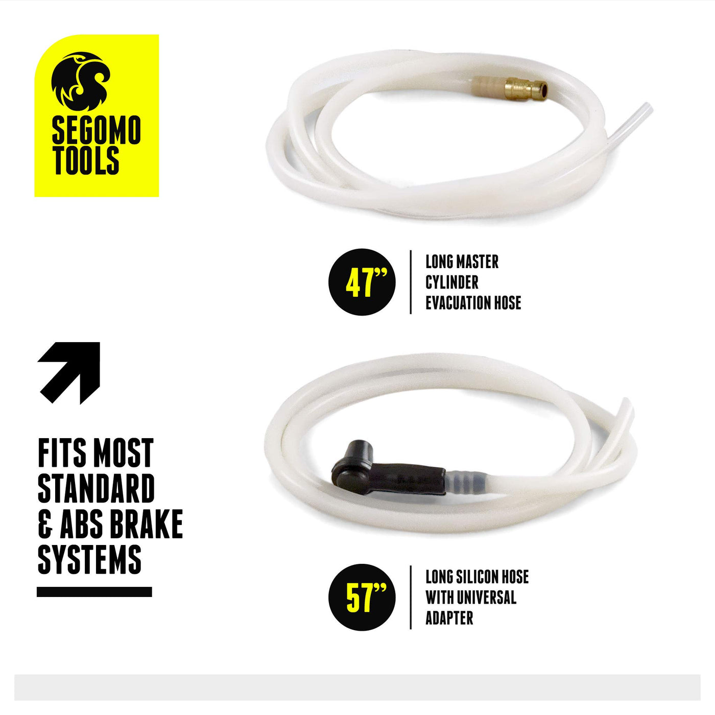 Q: What is included in the Segomo Tools Brake Bleeder kit?A: The kit includes a 57-inch long silicon hose with a universal rubber adapter compatible with most standard and ABS brake systems, as well as a 47-inch long master cylinder evacuation hose for effectively bleeding brakes directly into the master cylinder.
