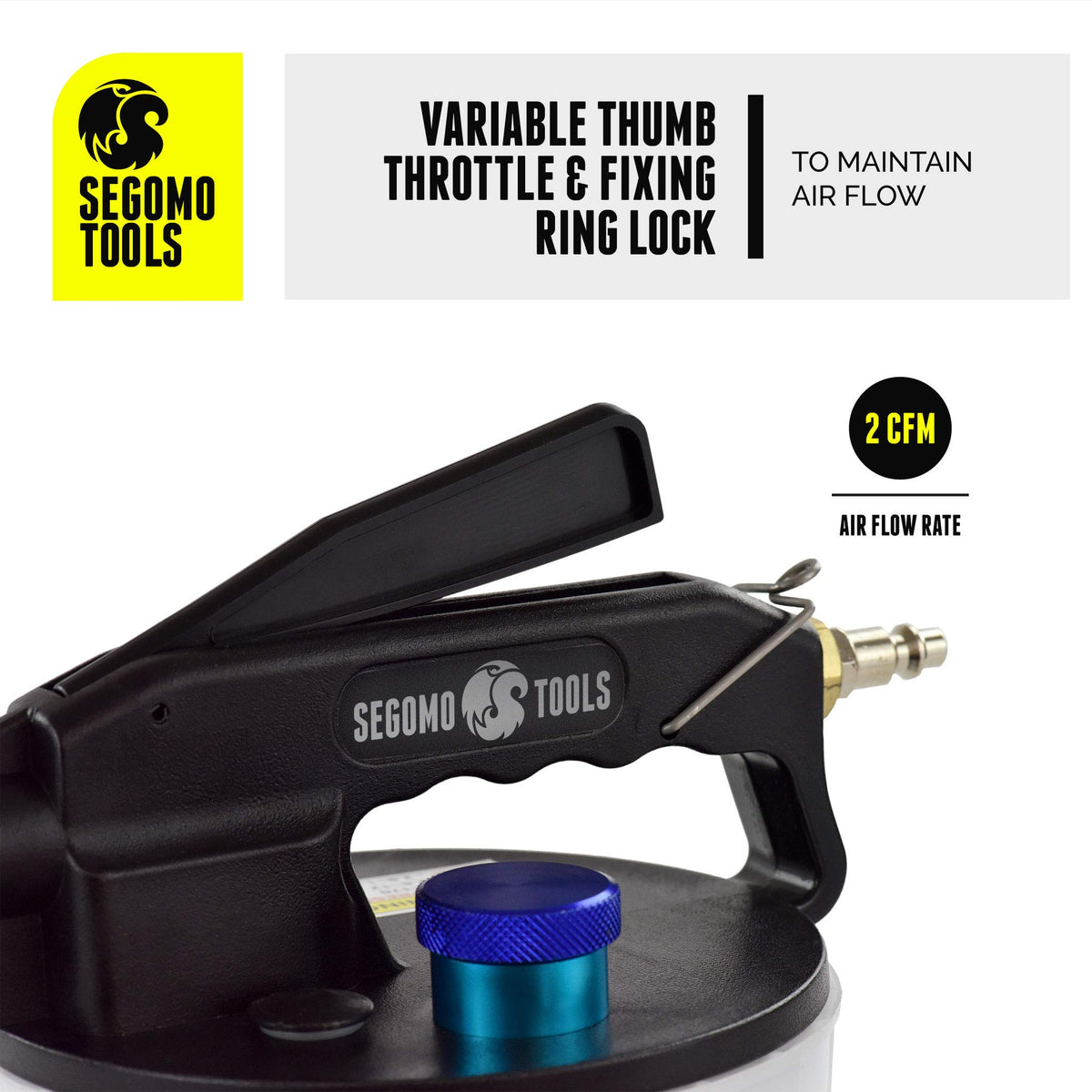Q: What features make this brake bleeder easy to use?A: The Segomo Tools Brake Bleeder is equipped with a stable base for easy handling, a variable thumb throttle to control air flow, and a built-in silencer for quieter operation. These features enhance usability and make brake fluid changes more efficient.