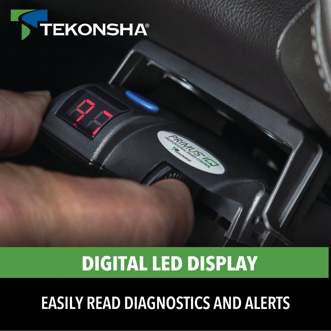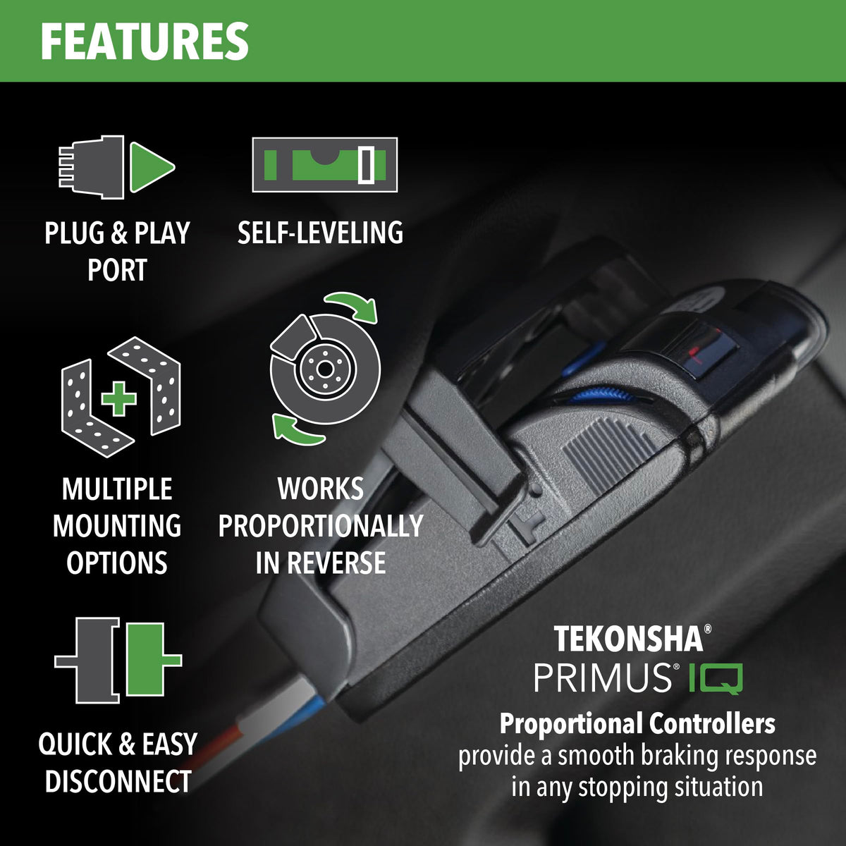 The Tekonsha Primus Iq Electric Trailer Brake Controller Gives You Dependable Braking Power In A Compact Design As An Industry Staple For More Than Ten Years, This Proportional Braking System Provides A Smooth Braking Response In Any Stopping Situation With Its Petite Yet Durable Exterior, This Trailer Brake Controller Fits Nicely Under The Dash, Making It Easily Accessible From The Driveras Seat Without Being In The Way While Also Compact, The Brains Of The Primus Iq Are Astute This Insightful Brake Controller Has An Easy-To-Read Led Display, Self-Diagnostic Check To Monitor Your Connection And Trailer Braking Activity, And Is Self-Leveling When Mounted Within A 90-Degree Vertical Range, So Thereas No Need To Adjust The Unit Once Itas Installed It Also Features A Power Output Knob To Quickly And Easily Set Your Desired Braking Power, A Boost Option That Lets You Apply Up To Three Levels Of Additional Trailer Braking Power, Especially When Hauling Heavier Loads, And Manual Override The Primus Iq Was Created To Work With Electric Over Hydraulic Braking Systems, Works Proportionally In Reverse To Make Backing Into Tough Spots A Bit Easier, And - Like The Prodigy P3, Prodigy P2, And Many Other Tekonsha Brake Controllers - Utilizes Primary Sensor Technology To Ensure The Smoothest Stop Possible When Youare Done Towing, The Iqas Snap-In Dash Mounting Clip, Plug & Play Port For Two Plug Adapters, And Removeable Electrical Connector Allow The Unit To Be Quickly Stored The Primus Iq Is Truly A Complete Trailer Brake Controller Kit It Works With Trailers With 1-3 Axles, Comes With All Necessary Mounting Hardware, And Is Backed By A Limited Lifetime Warranty