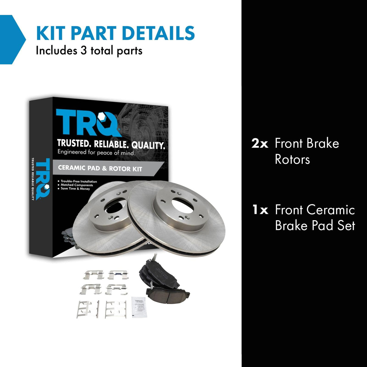Ceramic Brake Pad & Rotor KitKit Includes(1) Front Ceramic Brake Pad Set(2) Front Brake RotorsFitmentCompatible with: 1998-02 Honda Accord V6 3.0L FrontProduct AttributesBrake Pad Friction Material: CeramicBrake Pad Bonding Type: Premium PosiProduct Features Positive Molded - Less dust resulting in clean wheels G3000 Casting Alloy - Reduced noise and improved wear resistance Application Specific Design - Extended service life, no modificationsItem DetailsTRQ brake kits are designed to restore your brake system to like-new performance. TRQ brake pads are positive molded, thermal scorched, chamfered, and utilize a multi-layer shim for enhanced performance and service life. TRQ rotors have a non-directional finish that reduces the break-in period for new rotors as well as reducing vibrations throughout the rotors lifecycle. All products are fit and road-tested in our Massachusetts R&D facility to ensure we deliver on our promise of Trusted Reliable Quality.Reference NumbersAcura: 45022S47000, 45022S87A01, 45022SL0010, 45022SL0G00, 45022SL0J00, 45022SL0J02, 45022SM5A00, 45022SP0A00, 45022ST7R01, 45022ST7R02, 45022SV5A01, 45022SX0J00Advance Auto Parts: 145232, 200478, N1000306722BRC, YH145232, YH145232C, YH145232P, YH200478, YH425686PAimco: 31257Altrom Imports: A31257American Remanufactured: 89-08040Autopartsource: 572420Autospecialty: JBR709, JBR709EAutoxtra: 125669, 8096711, AX31257, AX901186AutoZone: 31257, 31257B, 31257DG, 31257DL, 74014, DL31257Beck/Arnley: 080-2725, 083-2725Bendix: 145232, PRT5232Bosch: 26010731, 26011547BrakeBest: 26010731, 26011547, 81-125669, 96711, 96711FZN, 96711R, 96711RGS, 981001, 981001FZN, 981001R, 981001RGS, BD125669Brembo: 09.7932.10, 25549Bridgestone: 7012791Casting Numbers: 325465Centric Parts: 120.40036, 120.40036CRY, 120.40078, 121.40036, 121.40078, 121.46010, 125.40036, 125.40036CRY, 126.40036CSL, 126.40036CSR, 126.40036SL, 126.40036SR, 127.40036CL, 127.40036CR, 127.40036L, 127.40036R, 128.40036CL, 128.40036CR, 128.40036L, 128.40036R, 227.40036L, 227.40036R, 320.40036Continental-ContiTech: CW23705Dura Corp: BR31257, BR3125702, BR901186DuraGo: BR31257, BR3125702, BR31305, BR901186, BR901466Dynamic Friction Company: 600-59034, 604-59042GREN: 46002Guardian: 52-125669Hollander: 530-58802Honda: 45022S10000, 45022S10A02, 45022S30A00, 45022S30A01, 45022S30A02, 45022S47000, 45022S87A01, 45022SM5A00, 45022SS0A00, 45022SV5A00, 45022SX0J00, 45251DSCA00, 45251S7AE10, 45251S87A00, 45251SDCA00, 45251SMGG11, 45251T2FA00, 45251T2FA01, 45251TA0A00, 45251TA0A01, 45251TA0A02, 45251TA5A00Isuzu: 5862030430, 5862056370, 5862070740, 5862072050Mighty Distributing System: 31257Monroe Brakes: BD125669NAPA BRAKES: SDK6121, TSR488Newtek Automotive USA: 31257, R1186PowerStop: JBR1556EVC, PSR6620991Promax: 14-31257, 14-31622, 20-31257Qualis: 10131257, 31257, 31305Qualitee International: 64-72-420Quality Brand: 31257, Q127Raybestos Brakes: 96711, 96711FZN, 96711P, 96711R, 981001, 981001R, EHT503H, MGD503CH, SGD503CStandard Rotors and Drums: 31257, GP31257TruStar: 472420, R72420TRW: DF7199, DF7199SUAP: 2901186, 31257, R40078Ultra Brake: HO-5051, HO-574Universal: 108800VIPAR - Vehicle Indusrty Parts & Manufacturing: X51275WABCO - Archived: PS125669Wagner Brake: BD125669, BD125669E, BD180560, BD180560EWagner: BD125669, BD126543Winhere: 6620350, 6620991, YH2554