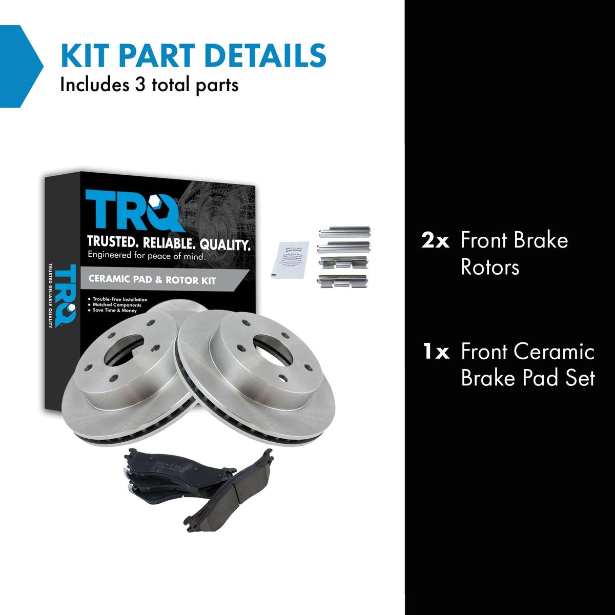 Ceramic Brake Pad & Rotor KitKit Includes(1) Front Ceramic Brake Pad Set(2) Front Brake RotorsFitmentCompatible with: 2000-01 Dodge Ram 1500 Truck 4 Wheel Drive FrontProduct AttributesFront Brake Rotor Diameter: 12.13 in. (308mm)Wheel Lug Count: 5 LugBrake Pad Friction Material: CeramicBrake Pad Bonding Type: Premium PosiFront Brake Rotor Venting Type: VentedProduct Features Positive Molded - Less dust resulting in clean wheels G3000 Casting Alloy - Reduced noise and improved wear resistance Application Specific Design - Extended service life, no modificationsItem DetailsTRQ brake kits are designed to restore your brake system to like-new performance. TRQ brake pads are positive molded, thermal scorched, chamfered, and utilize a multi-layer shim for enhanced performance and service life. TRQ rotors have a non-directional finish that reduces the break-in period for new rotors as well as reducing vibrations throughout the rotors lifecycle. All products are fit and road-tested in our Massachusetts R&D facility to ensure we deliver on our promise of Trusted Reliable Quality.Reference NumbersAimco: 5394Bendix: PRT5305DuraGo: BR5394Ford: F75Z2001AAHollander: 530-02073Lincoln: F75Z2001AARaybestos Brakes: 76917, 76917FZN, 76917P, 76917R, EHT702H, MGD702CHWagner: BD125744