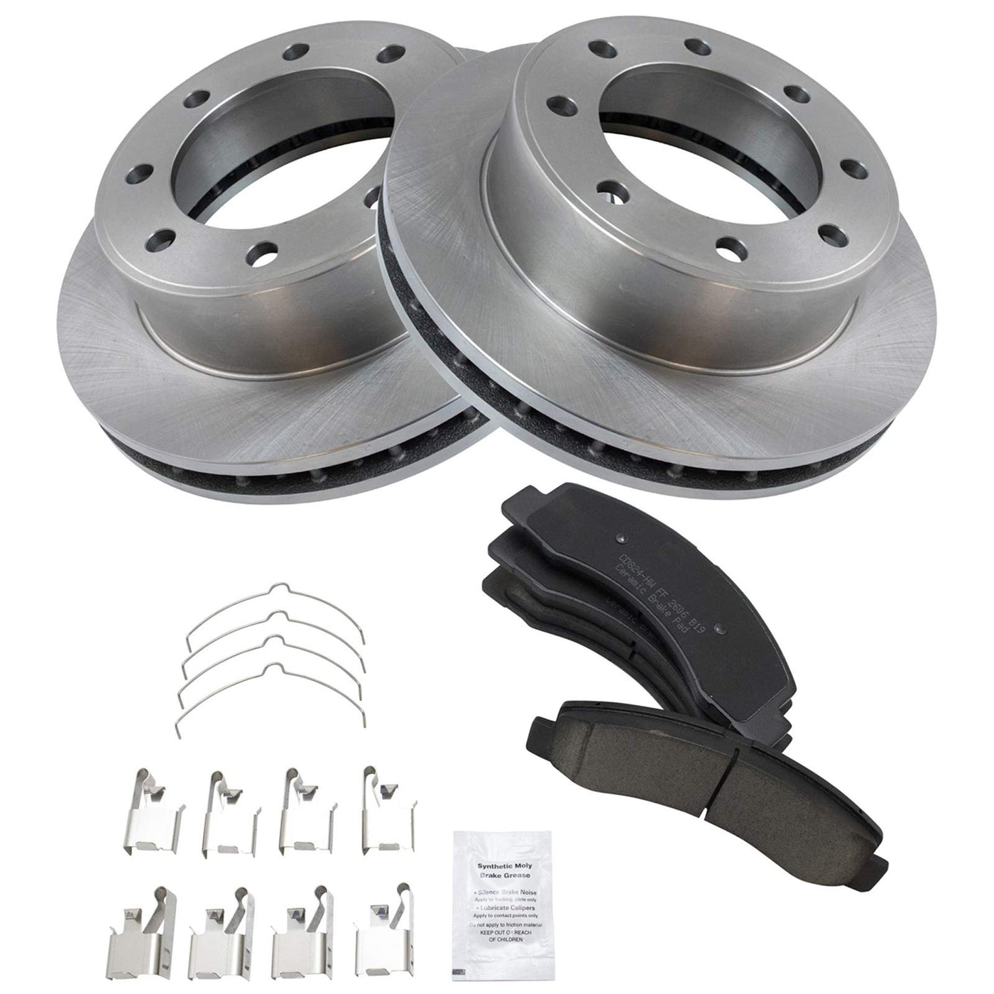 Ceramic Brake Pad & Rotor KitKit Includes(1) Front Ceramic Brake Pad Set(2) Front Brake RotorsFitmentCompatible with: 2000-04 Ford F250 Super Duty Truck 4 Wheel Drive FrontCompatible with: 2002-04 Ford F350 Super Duty Truck 4 Wheel Drive Front with 13 in. 330mm Diameter Front RotorsCompatible with: 2000-05 Ford Excursion 4 Wheel Drive FrontCompatible with: 2000 Ford F350 Super Duty Truck 4 Wheel Drive Front with 13 in. 330mm Diameter Front RotorsCompatible with: 2001 Ford F350 Super Duty Truck 4 Wheel Drive Front with 13 in. 330mm Diameter Front Rotors with 4 Wheel ABS BrakesProduct AttributesBrake Pad Friction Material: CeramicBrake Pad Bonding Type: Premium PosiProduct Features Positive Molded - Less dust resulting in clean wheels G3000 Casting Alloy - Reduced noise and improved wear resistance Application Specific Design - Extended service life, no modificationsItem DetailsTRQ brake kits are designed to restore your brake system to like-new performance. TRQ brake pads are positive molded, thermal scorched, chamfered, and utilize a multi-layer shim for enhanced performance and service life. TRQ rotors have a non-directional finish that reduces the break-in period for new rotors as well as reducing vibrations throughout the rotors lifecycle. All products are fit and road-tested in our Massachusetts R&D facility to ensure we deliver on our promise of Trusted Reliable Quality.Reference NumbersAimco: 54078Bendix: PRT5274DuraGo: BR54078Ford: 1C3Z2001AA, F81Z2001EAHollander: 530-02052Raybestos Brakes: 66914, 66914FZN, 66914P, 66914PER, 66914R, PGD824MWagner: BD125715