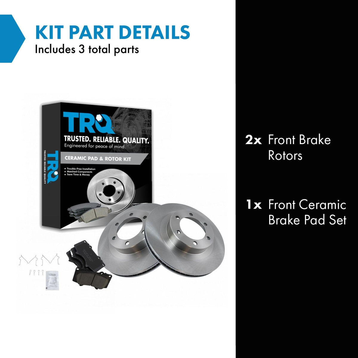 Ceramic Brake Pad & Rotor KitKit Includes(1) Front Ceramic Brake Pad Set(2) Front Brake RotorsFitmentCompatible with: 2003-09 Toyota 4Runner Front with Caliper Casting #13WHCompatible with: 2003-09 Lexus GX470 FrontProduct AttributesFront Brake Rotor Diameter: 13.31 in. (338mm)Wheel Lug Count: 6 LugBrake Pad Friction Material: CeramicBrake Pad Bonding Type: Premium PosiFront Brake Rotor Venting Type: VentedProduct Features Positive Molded - Less dust resulting in clean wheels G3000 Casting Alloy - Reduced noise and improved wear resistance Application Specific Design - Extended service life, no modificationsItem DetailsTRQ brake kits are designed to restore your brake system to like-new performance. TRQ brake pads are positive molded, thermal scorched, chamfered, and utilize a multi-layer shim for enhanced performance and service life. TRQ rotors have a non-directional finish that reduces the break-in period for new rotors as well as reducing vibrations throughout the rotors lifecycle. All products are fit and road-tested in our Massachusetts R&D facility to ensure we deliver on our promise of Trusted Reliable Quality.Reference NumbersAimco: 31326Bendix: PRT5457DuraGo: BR31326Lexus: 446535250, 446535290, 446560320Mitsubishi: 4605A481Raybestos Brakes: 980160, 980160FZN, 980160P, 980160PER, 980160R, EHT976H, MGD976CH, SGD976CToyota: 044650K280, 044650K390, 446504070, 446504090, 446535290, 446560320Wagner: BD126089