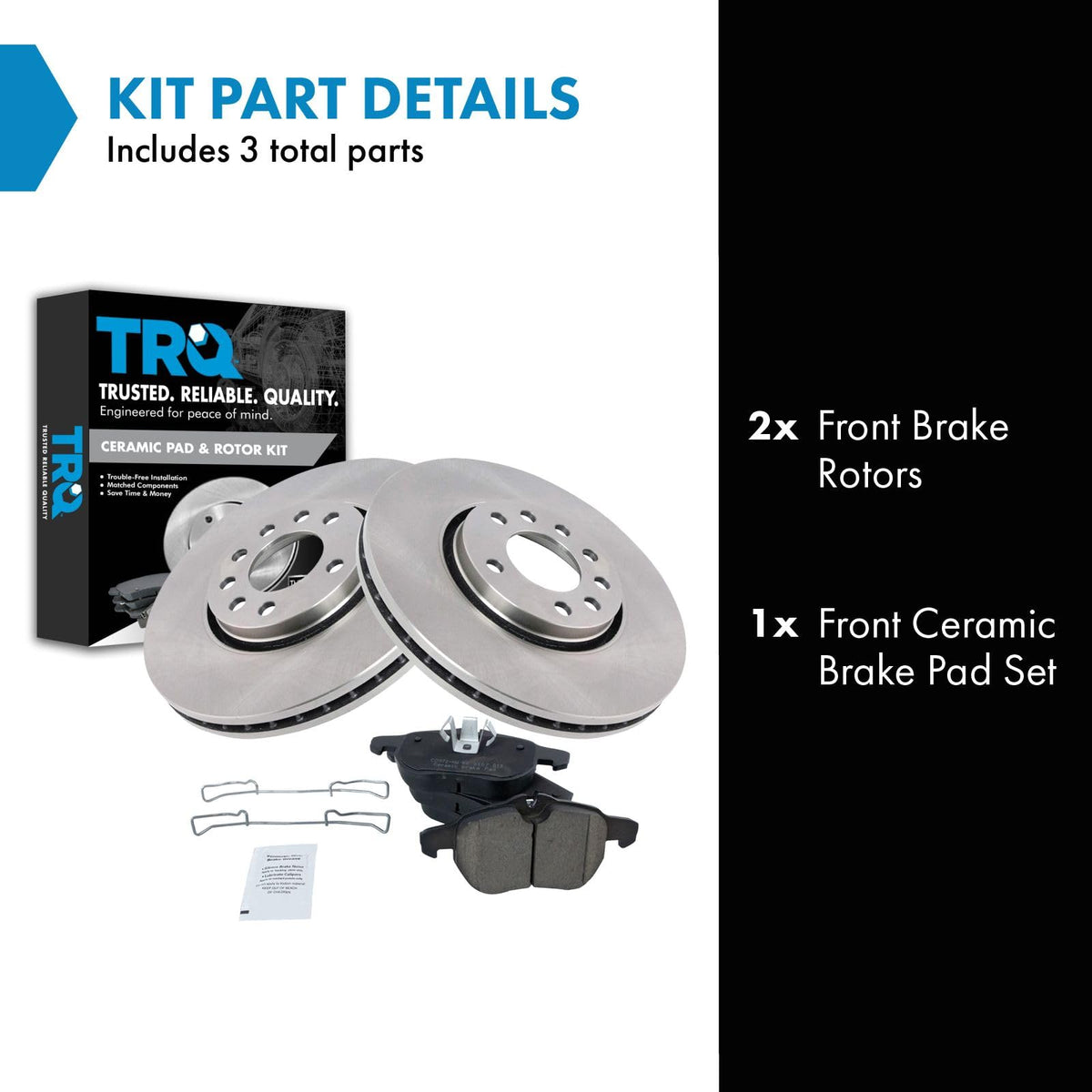 Ceramic Brake Pad & Rotor KitKit Includes(1) Front Ceramic Brake Pad Set(2) Front Brake RotorsFitmentCompatible with: 2004-08 Saab 9-3 Front with 302 mm Diameter Front RotorsCompatible with: 2003 Saab 9-3 Vector Front with 302 mm Diameter Front RotorsCompatible with: 2003 Saab 9-3 Linear Front with 302 mm Diameter Front RotorsCompatible with: 2003 Saab 9-3 Arc Front with 302 mm Diameter Front RotorsCompatible with: 2010-11 Saab 9-3 Front with 302 mm Diameter Front RotorsCompatible with: 2009 Saab 9-3 2.0T Front with 302 mm Diameter Front RotorsCompatible with: 2010 Saab 9-3X Front with 302 mm Diameter Front RotorsProduct AttributesFront Brake Rotor Diameter: 11.89 in. (302mm)Wheel Lug Count: 5 LugBrake Pad Friction Material: CeramicBrake Pad Bonding Type: Premium PosiFront Brake Rotor Venting Type: VentedProduct Features Positive Molded - Less dust resulting in clean wheels G3000 Casting Alloy - Reduced noise and improved wear resistance Application Specific Design - Extended service life, no modificationsItem DetailsTRQ brake kits are designed to restore your brake system to like-new performance. TRQ brake pads are positive molded, thermal scorched, chamfered, and utilize a multi-layer shim for enhanced performance and service life. TRQ rotors have a non-directional finish that reduces the break-in period for new rotors as well as reducing vibrations throughout the rotors lifecycle. All products are fit and road-tested in our Massachusetts R&D facility to ensure we deliver on our promise of Trusted Reliable Quality.Reference NumbersAimco: 34267Bendix: PRT5600, PRT5809DuraGo: BR34267Hollander: 530-59021Raybestos Brakes: 980328, 980328FZN, 980328P, 980328R, PGD972MSaab: 93166943Wagner: BD126069, BD180155