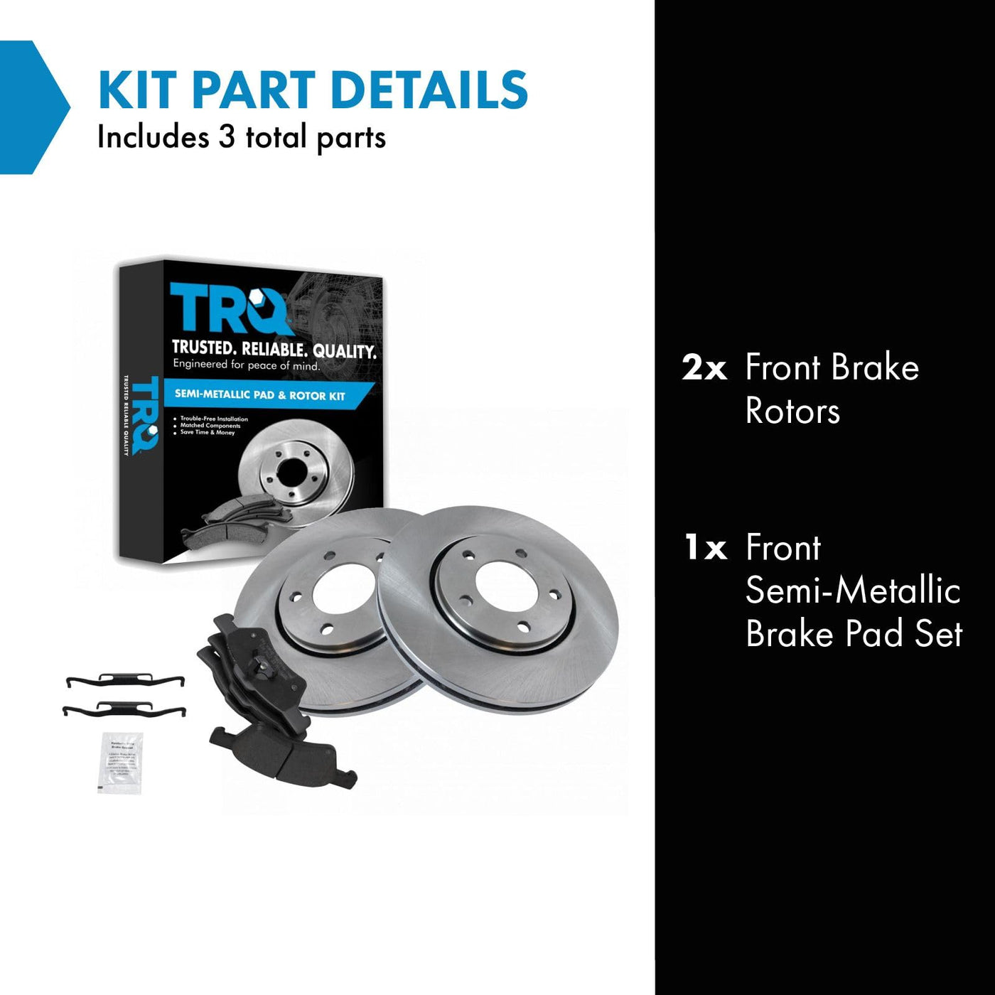 Semi-Metallic Brake Pad & Rotor KitKit Includes(1) Front Semi-Metallic Brake Pad Set(2) Front Brake RotorsFitmentCompatible with: 2005-07 Chrysler Town & Country Front with 4 Wheel Disc BrakesCompatible with: 2005-07 Dodge Grand Caravan Front with 4 Wheel Disc BrakesCompatible with: 2005-07 Dodge Caravan Front with 4 Wheel Disc BrakesCompatible with: 2001-02 Dodge Grand Caravan Front with 4 Wheel Disc BrakesCompatible with: 2003-04 Dodge Grand Caravan Front with 4 Wheel Disc BrakesCompatible with: 2001-02 Chrysler Town & Country Front with 4 Wheel Disc BrakesCompatible with: 2003-04 Chrysler Town & Country Front with 4 Wheel Disc BrakesCompatible with: 2003-04 Dodge Caravan Front with 4 Wheel Disc BrakesCompatible with: 2003-04 Dodge Caravan Front with Rear Drum Brakes without ABS BrakesCompatible with: 2001-02 Dodge Caravan Front with 4 Wheel Disc BrakesCompatible with: 2003-04 Chrysler Town & Country Front with Rear Drum Brakes without ABS BrakesCompatible with: 2003-04 Dodge Grand Caravan Front with Rear Drum Brakes without ABS BrakesProduct AttributesBrake Pad Bonding Type: Premium PosiBrake Pad Friction Material: Semi-MetallicProduct Features Positive Molded - Less dust resulting in clean wheels G3000 Casting Alloy - Reduced noise and improved wear resistance Application Specific Design - Extended service life, no modificationsItem DetailsTRQ brake kits are designed to restore your brake system to like-new performance. TRQ brake pads are positive molded, thermal scorched, chamfered, and utilize a multi-layer shim for enhanced performance and service life. TRQ rotors have a non-directional finish that reduces the break-in period for new rotors as well as reducing vibrations throughout the rotors lifecycle. All products are fit and road-tested in our Massachusetts R&D facility to ensure we deliver on our promise of Trusted Reliable Quality.Reference NumbersAdvance Auto Parts: 145308, YH145308, YH145308C, YH145308PAimco: 10153002, 53002, 53004American Remanufactured: 89-40049Autopartsource: 591140Autospecialty: AR8751, AR8751EAutoxtra: 80780037, AX53002AutoZone: 53002, 53002DG, DL53002Bendix: 145308, PRT5350Bosch: RBR53002BrakeBest: 16010141, 780037, 780037FZN, 780037R, 780037RGS, 81-125761, BD125761Casting Numbers: 135367, 211390-C, 325545, TRW135367Centric Parts: 120.67049, 120.67049CRY, 121.67049, 121.67049CRY, 126.67049CSL, 126.67049CSR, 126.67049SL, 126.67049SR, 127.67049CL, 127.67049CR, 127.67049L, 127.67049R, 128.67049CL, 128.67049CR, 128.67049L, 128.67049R, 320.67049, 320.67049FChrysler: 04721830AC, 05019803AA, 05019804AA, 05019981AA, 05019981AB, 4721830AC, 5019981AA, 5019981ABContinental-ContiTech: CW28726Dodge: 05019803AA, 05019804AADura Corp: BR53002, BR5300202DuraGo: BR53002, BR53002-02, BR5300202, BR53004, BR5300402, P780037Formula Blue Hydraulic Brake Parts: E12572054GREN: 623802Guardian: 52-125761Hollander: 530-02093, 530-02094Mighty Distributing System: 53002Monroe Brakes: BD125761NAPA: 880037Newtek Automotive USA: 53002Omnicraft: QBRR215Promax: 14-53002, 20-53002Pronto: 10153002, 53002, BR53002QBP International: EC53002, Q53002Qualis: 53002, 53004Qualitee International: 64-91-140Quality Brand: 53002, Q4094Raybestos Brakes: 780037R, 780049, 780049FZN, 780049P, 780049R, EHT857RS Parts: RS780037Standard Rotors and Drums: 53002Transglobe Automotive: GBC53002, GC53002Transit: 8-780037, GCR780037TruStar: 491140, R91140UAP: 53002Ultra Brake: 53110Universal: 103161VIPAR - Vehicle Indusrty Parts & Manufacturing: X51384WABCO - Archived: PS125761Wagner Brake: BD125761, BD125761EWagner: BD125768Winhere: 662722, YH2722