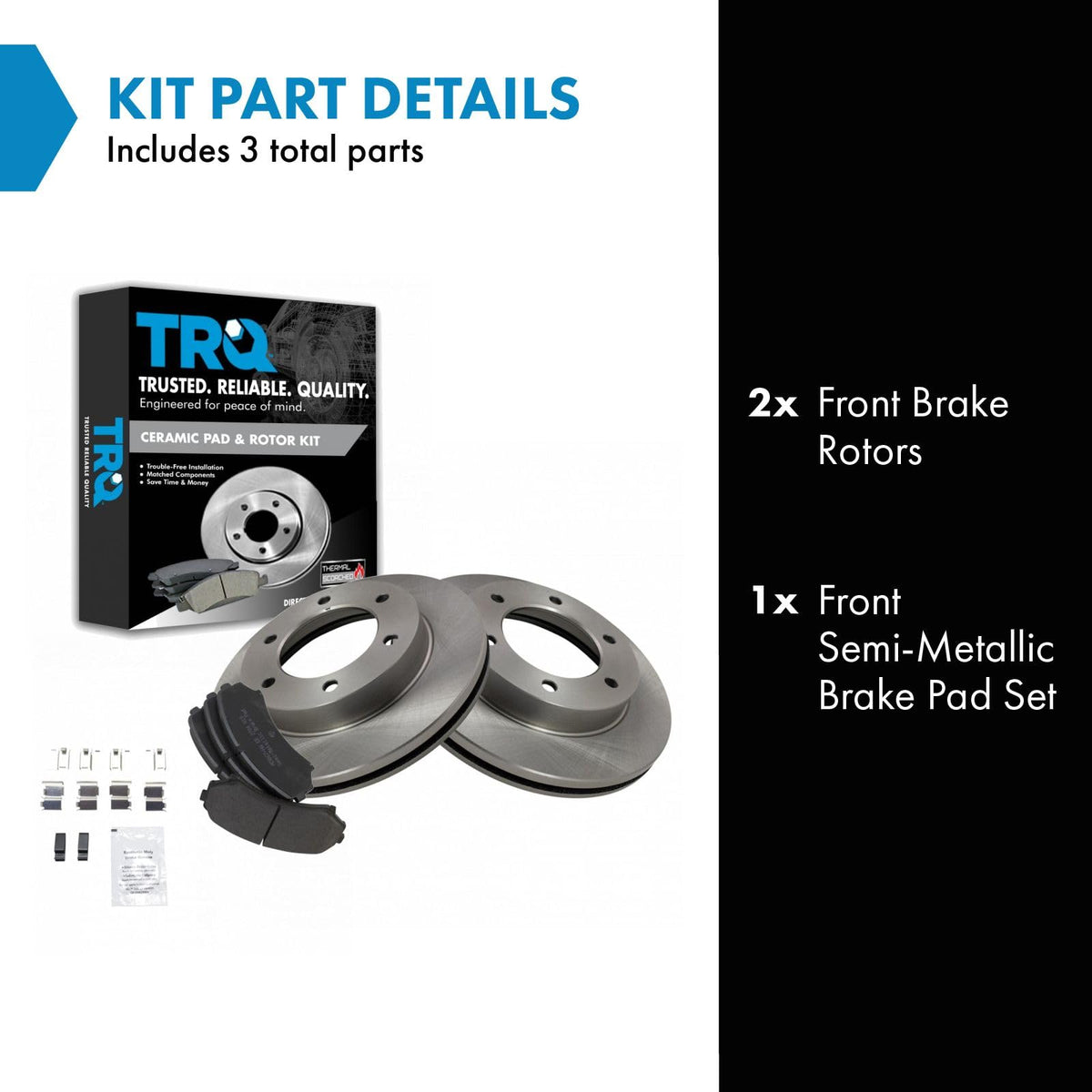 Semi-Metallic Brake Pad & Rotor KitKit Includes(1) Front Semi-Metallic Brake Pad Set(2) Front Brake RotorsFitmentCompatible with: 2002-04 Isuzu Rodeo FrontCompatible with: 2002 Isuzu Axiom From 12/01/01 Production Date FrontCompatible with: 2002-03 Isuzu Rodeo Sport FrontCompatible with: 2002 Honda Passport FrontCompatible with: 2003-04 Isuzu Axiom FrontProduct AttributesFront Brake Rotor Diameter: 11.42 in. (290mm)Wheel Lug Count: 6 LugBrake Pad Friction Material: Semi-MetallicFront Brake Rotor Venting Type: VentedProduct Features Positive Molded - Less dust resulting in clean wheels G3000 Casting Alloy - Reduced noise and improved wear resistance Application Specific Design - Extended service life, no modificationsItem DetailsTRQ brake kits are designed to restore your brake system to like-new performance. TRQ brake pads are positive molded, thermal scorched, chamfered, and utilize a multi-layer shim for enhanced performance and service life. TRQ rotors have a non-directional finish that reduces the break-in period for new rotors as well as reducing vibrations throughout the rotors lifecycle. All products are fit and road-tested in our Massachusetts R&D facility to ensure we deliver on our promise of Trusted Reliable Quality.Reference NumbersAimco: 31310Auto Extra: AXMD867Bendix: PRT5402DuraGo: BR31310Hollander: 530-58954Honda: 8972872630Isuzu: 8972872630Mitsubishi: MN116446, MR510539Raybestos Brakes: 980081, 980081FZN, 980081P, 980081R, EHT867HWagner: BD126098