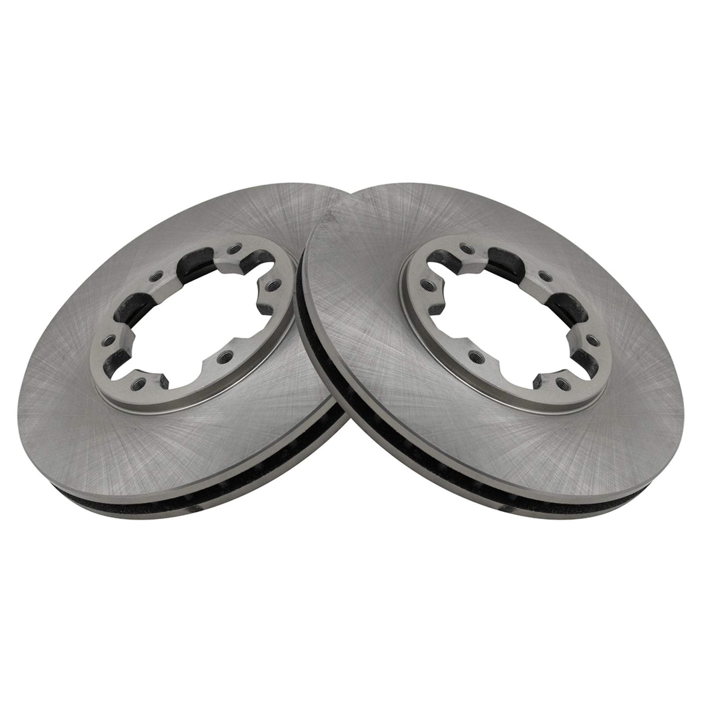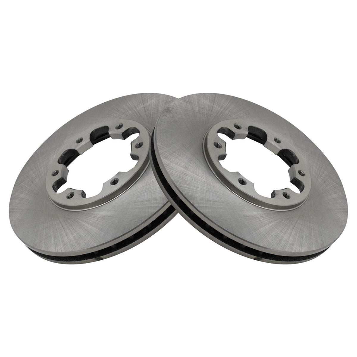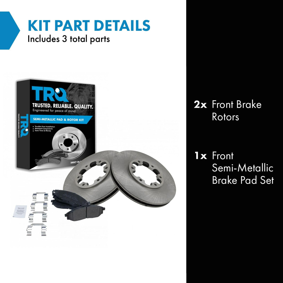 Semi-Metallic Brake Pad & Rotor KitKit Includes(1) Front Semi-Metallic Brake Pad Set(2) Front Brake RotorsFitmentCompatible with: 2000-04 Nissan Xterra FrontCompatible with: 2003-04 Nissan Frontier V6 3.3L Rear Wheel Drive FrontCompatible with: 2003-04 Nissan Frontier 4 Wheel Drive FrontProduct AttributesFront Brake Rotor Diameter: 11.14 in. (283mm)Wheel Lug Count: 6 LugBrake Pad Bonding Type: Premium PosiBrake Pad Friction Material: Semi-MetallicFront Brake Rotor Venting Type: VentedProduct Features Positive Molded - Less dust resulting in clean wheels G3000 Casting Alloy - Reduced noise and improved wear resistance Application Specific Design - Extended service life, no modificationsItem DetailsTRQ brake kits are designed to restore your brake system to like-new performance. TRQ brake pads are positive molded, thermal scorched, chamfered, and utilize a multi-layer shim for enhanced performance and service life. TRQ rotors have a non-directional finish that reduces the break-in period for new rotors as well as reducing vibrations throughout the rotors lifecycle. All products are fit and road-tested in our Massachusetts R&D facility to ensure we deliver on our promise of Trusted Reliable Quality.Reference NumbersAimco: 31158Auto Extra: AXMD830Bendix: PRT5112DuraGo: BR31158Hollander: 530-58658, 530-58901Nissan: 410607Z025, 410607Z026Raybestos Brakes: 96615, 96615FZN, 96615P, 96615R, EHT830HWagner: BD125546